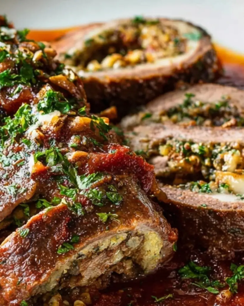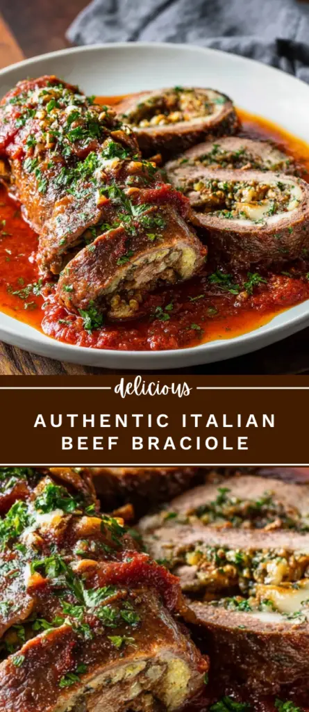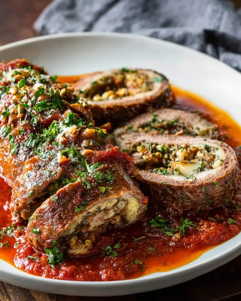 Tender flank steak is rolled with a savory filling of raisins, pine nuts, garlic, herbs, and cheese, then slowly braised in a rich tomato sauce until melt-in-your-mouth tender. This traditional Italian beef braciole is a comforting Sunday dinner classic, perfect served with pasta or crusty bread.