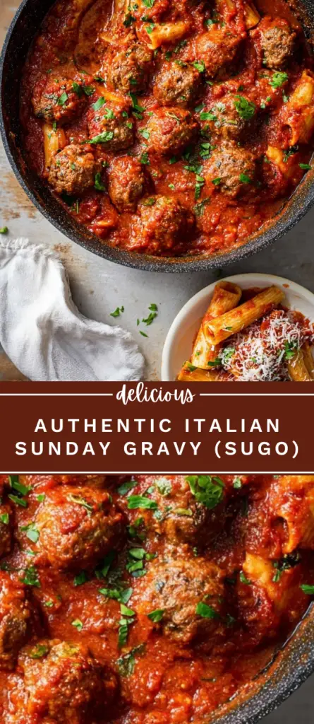 This authentic Italian Sunday gravy recipe features slow-simmered tomato sauce cooked with pork, sausage, and meatballs for deep, rich flavor. Made with simple ingredients and traditional techniques, this classic sugo is perfect for family dinners, holidays, and special occasions. Served with pasta, grated cheese, and ricotta, it’s a timeless Italian-American recipe known for tender meats and a well-balanced tomato sauce.