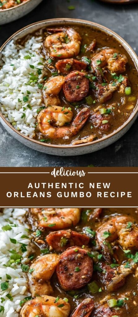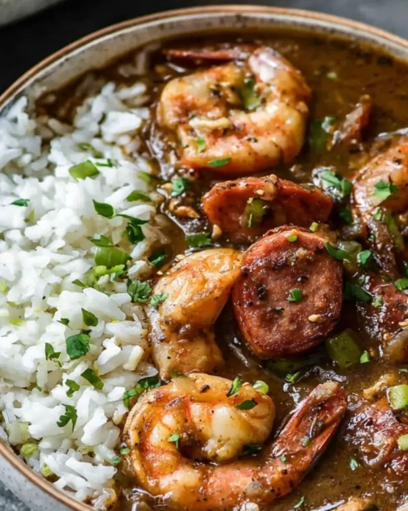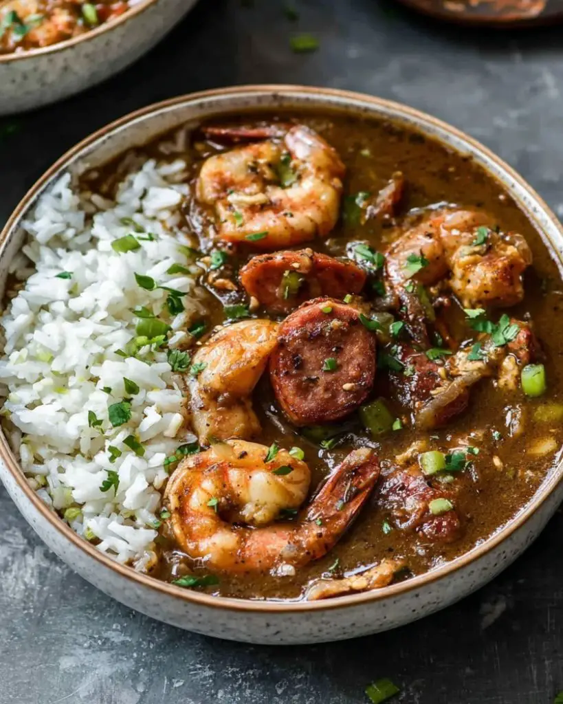 Rich, flavorful New Orleans gumbo made with a dark homemade roux, smoky andouille sausage, tender rotisserie chicken, and shrimp simmered in Cajun spices. This classic Louisiana recipe is a hearty Creole dish served over rice, perfect for family dinners, gatherings, and authentic Southern cooking at home.