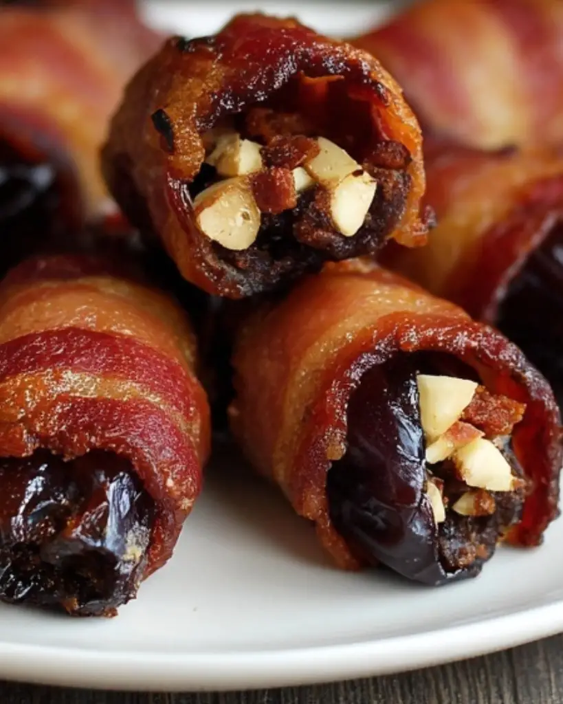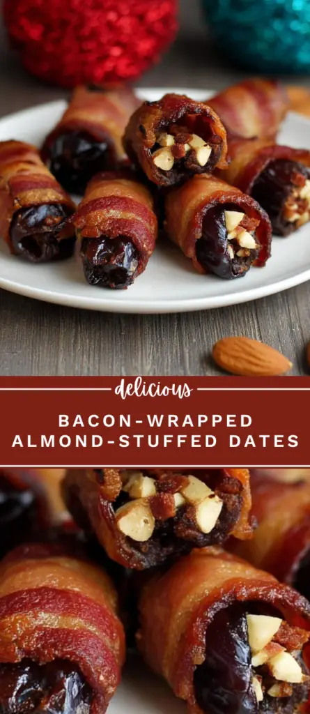 Bacon-wrapped almond-stuffed dates with crispy bacon and crunchy almonds, perfect for appetizers, parties, or holiday gatherings. This easy recipe combines sweet Medjool dates, savory bacon, and nuts for a simple, crowd-pleasing snack or finger food.