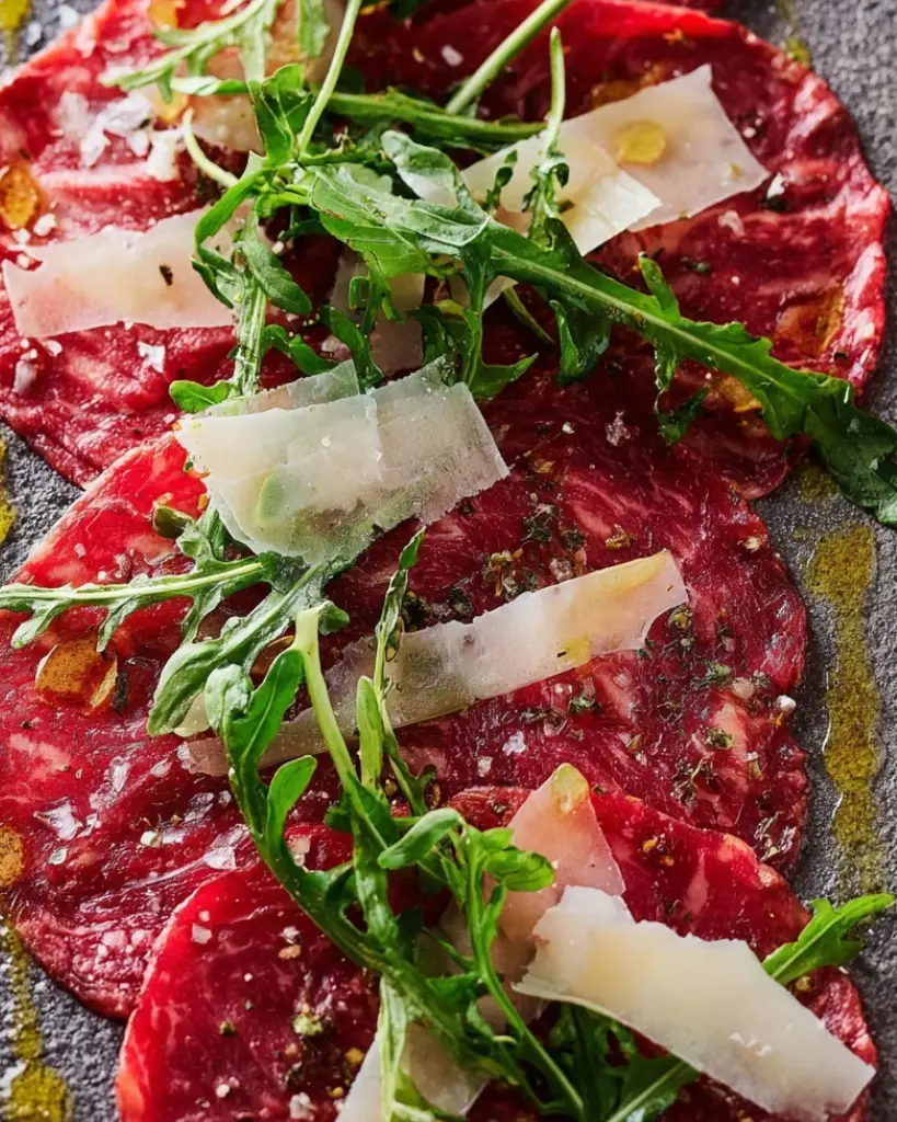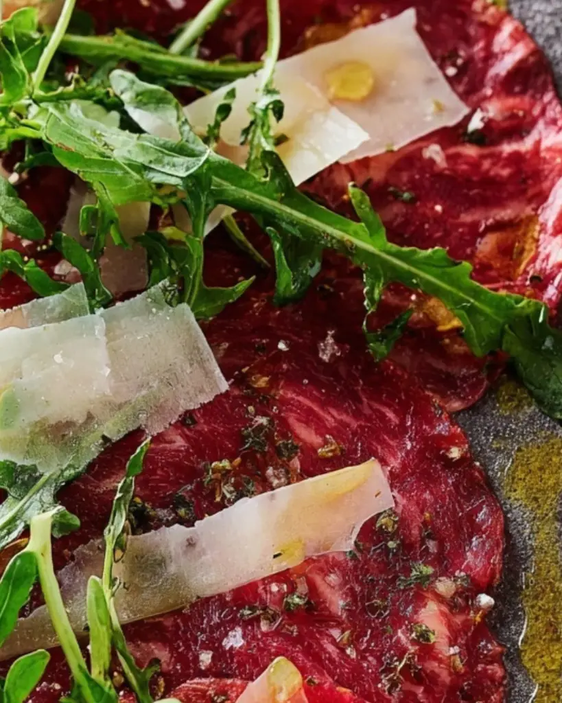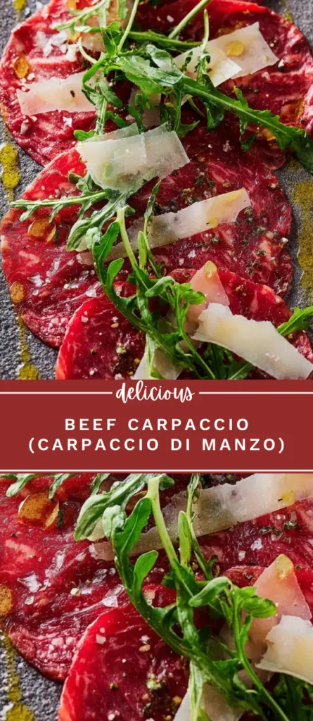 Beef carpaccio made with thinly sliced filet mignon, fresh arugula, shaved Parmesan, lemon juice, and extra virgin olive oil. This classic Italian appetizer features tender raw beef seasoned simply for a clean, elegant flavor. A popular carpaccio di manzo recipe ideal for starters, dinner parties, and Italian cuisine, using high-quality ingredients and quick preparation.