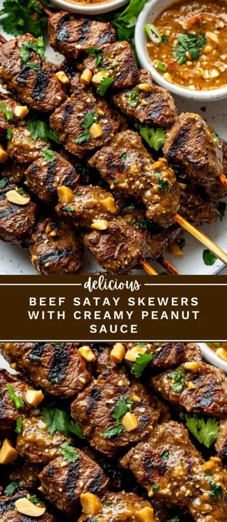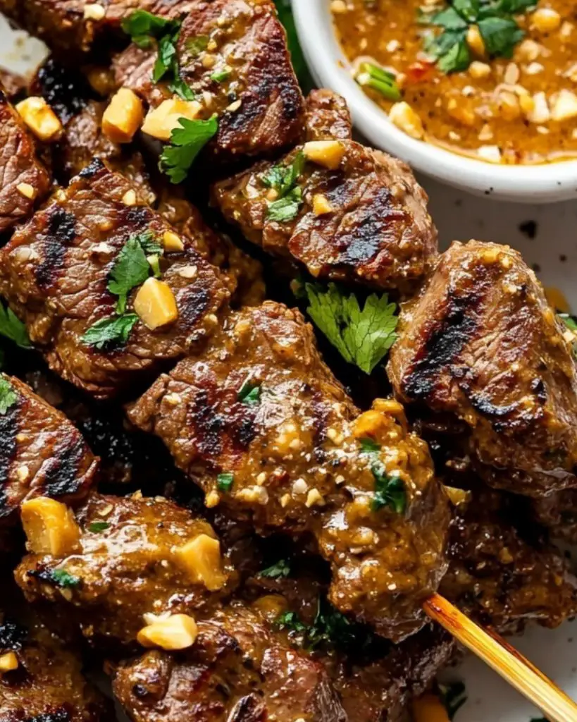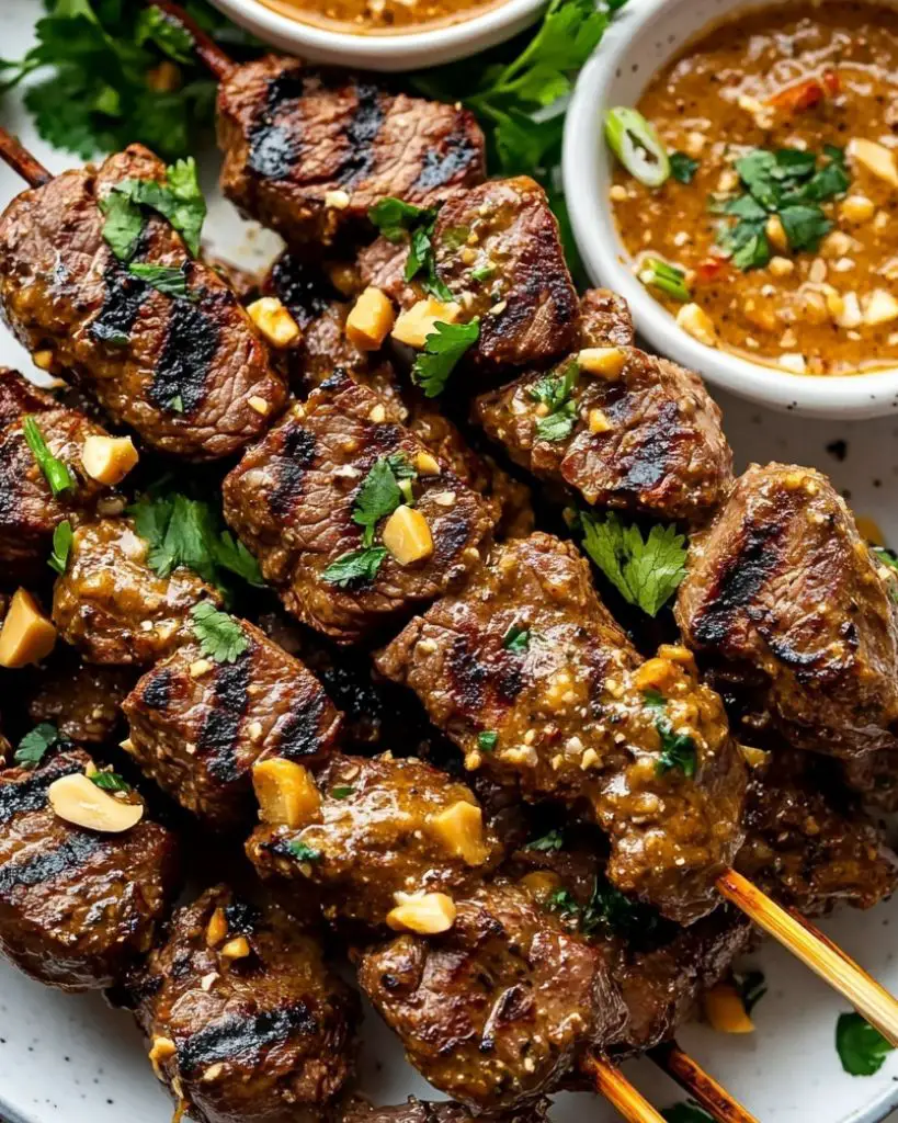 Beef satay skewers with peanut sauce are a quick and flavour-packed Asian-style recipe made with marinated steak, grilled to perfection, and served with a creamy coconut and peanut dipping sauce. Ideal for BBQs, dinner parties, or weeknight meals, this easy beef skewer recipe uses ingredients like lemongrass, fish sauce, and soy sauce for bold, authentic flavour. Serve with rice or salad for a complete meal.