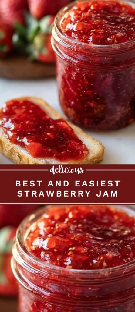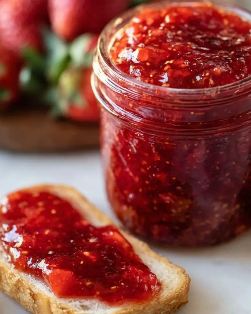 This easy strawberry jam recipe is made with fresh, ripe strawberries, sugar, and pectin for a perfectly sweet and spreadable texture. It’s the best way to make homemade strawberry jam without canning, ready in just a few simple steps. Ideal for toast, biscuits, or desserts, this quick freezer jam keeps its bright color and fresh flavor for weeks in the fridge or months in the freezer—perfect for breakfasts, snacks, and baking.