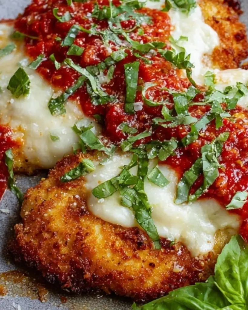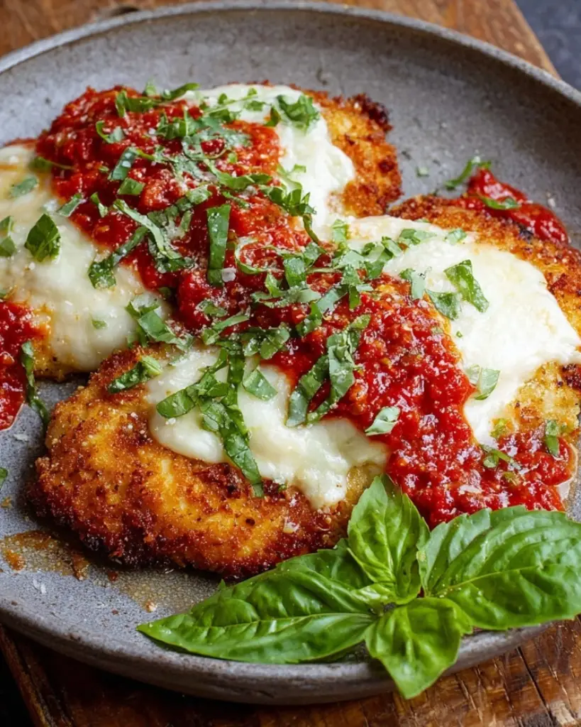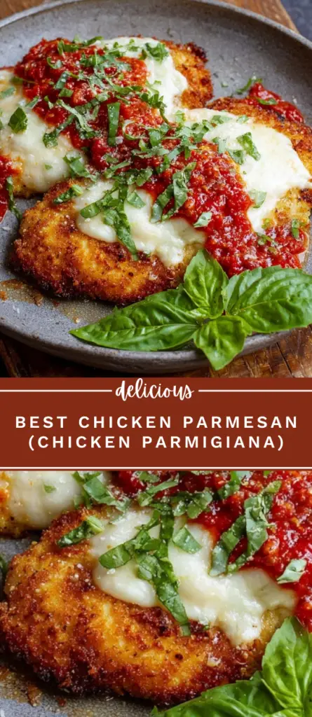 Chicken Parmesan made with crispy breaded chicken breasts, marinara sauce, melted mozzarella, and grated Pecorino Romano. This classic chicken parmigiana recipe delivers golden crust, juicy chicken, and rich tomato flavor. A popular Italian-American dinner idea perfect for family meals, weeknight dinners, or serving with pasta, salad, and garlic bread.