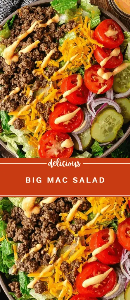This Big Mac Salad recipe delivers classic burger flavors in a fresh, low-carb bowl loaded with seasoned ground beef, crisp romaine, cheddar cheese, dill pickles, tomatoes, and a homemade special sauce. It’s a great option for quick weeknight dinners, keto meal prep, family lunches, and high-protein meals. This salad offers fast preparation, simple ingredients, and a lighter alternative to a traditional cheeseburger, making it a popular choice for healthy cooking and fast-food–inspired meals.
