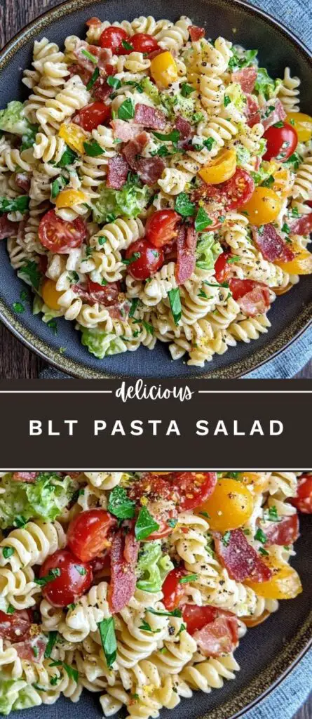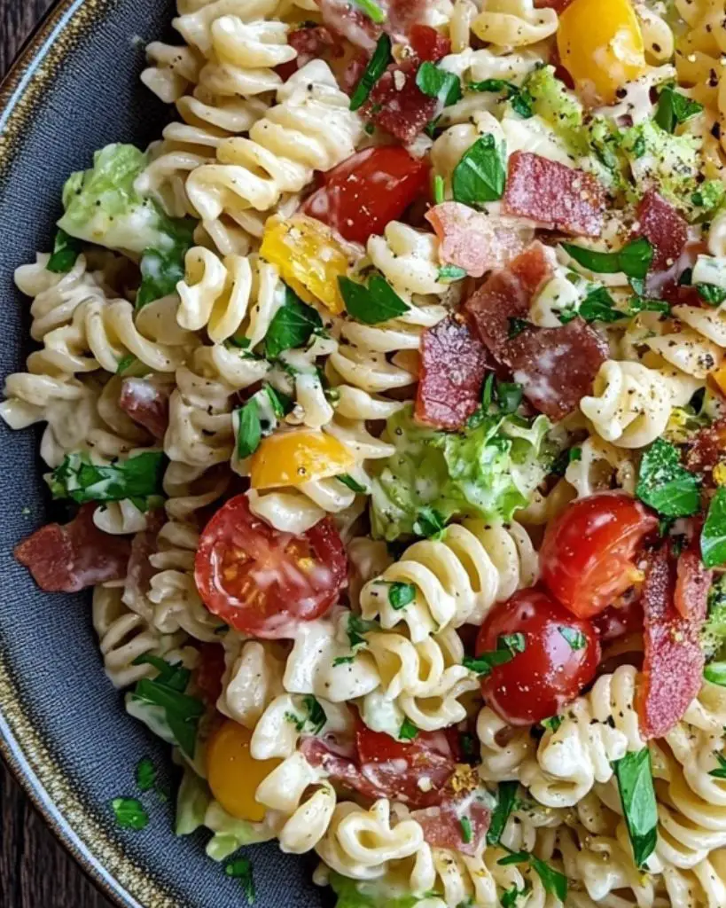 This BLT pasta salad recipe features crispy bacon, fresh lettuce, cherry tomatoes, and tender pasta tossed in a creamy homemade dressing. A perfect side dish for barbecues, potlucks, or family dinners. Easy to make ahead with simple ingredients and great for feeding a crowd.