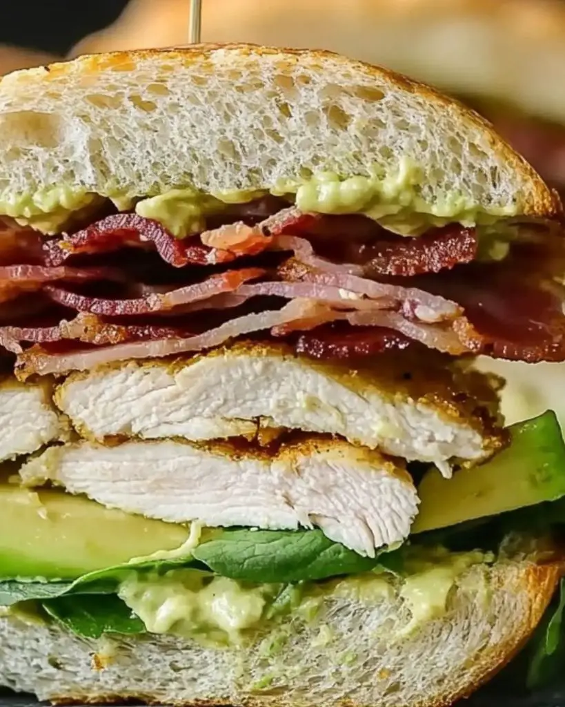 This Chicken Bacon Avocado Sandwich is packed with flavor, layered with rotisserie chicken, crispy bacon, creamy avocado, fresh veggies, and a tangy mustard mayo sauce—all served on soft, fluffy focaccia. It’s quick to assemble and perfect for lunch, dinner, or entertaining guests.