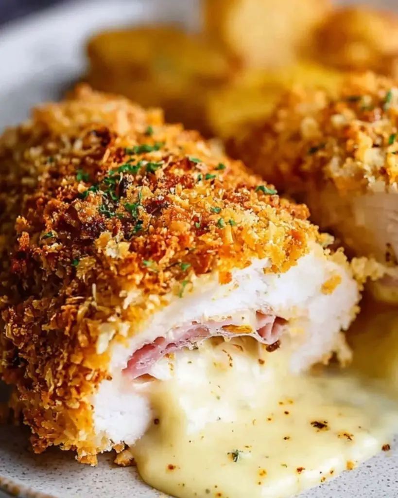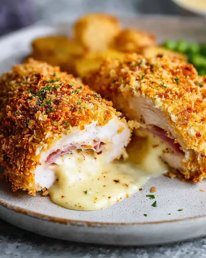 Crispy Chicken Cordon Bleu is a classic dinner recipe made with tender chicken breasts stuffed with ham and Swiss cheese, coated in a golden cornflake crust, and baked to perfection. This easy homemade version includes a creamy mustard sauce that pairs perfectly with the crunchy exterior and melty filling. Perfect for family dinners, holidays, or special occasions, this baked Chicken Cordon Bleu recipe is simple to prepare ahead of time and delivers restaurant-quality results at home.