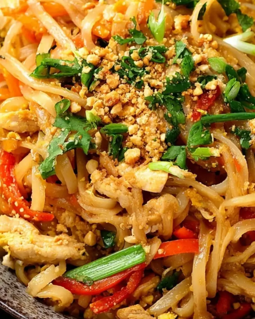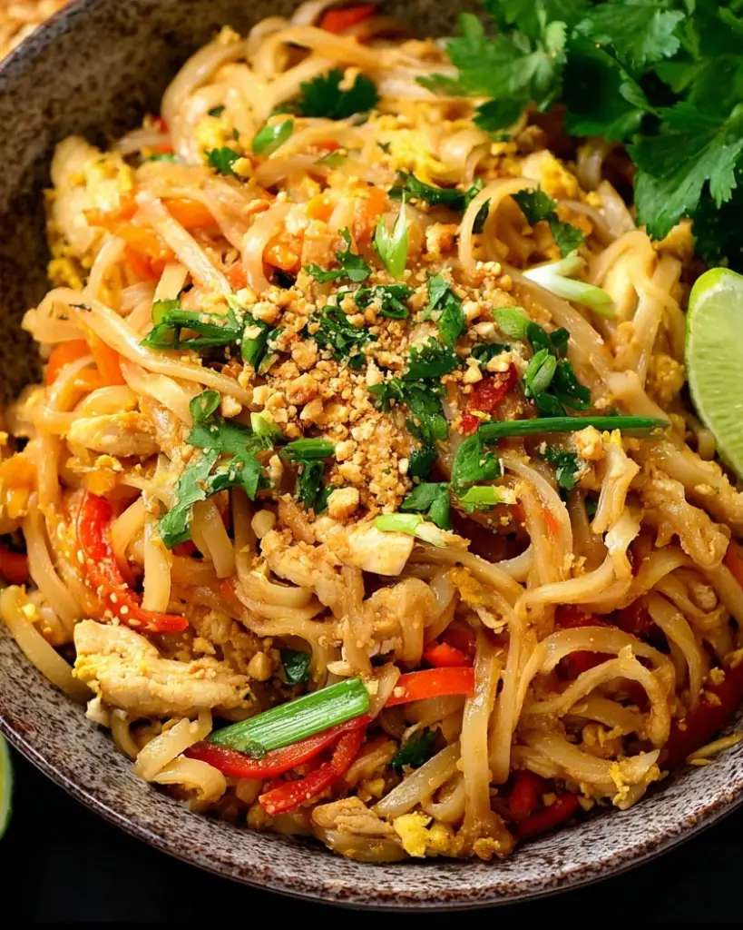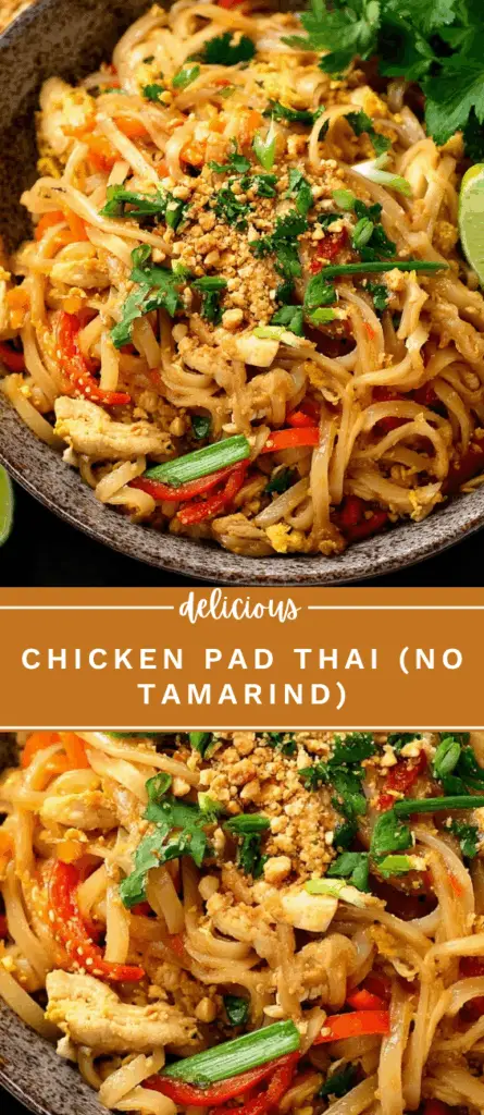 Make homemade Chicken Pad Thai without tamarind using thin rice noodles, tender chicken, fresh vegetables, and a flavorful sweet and savory sauce. This easy Thai stir-fry recipe combines eggs, peanuts, garlic, and a tangy Pad Thai sauce for a classic restaurant-style dish at home. Ready in under 30 minutes, it’s perfect for weeknight dinners, gluten-free diets, and customizable spice levels. Serve with lime wedges and fresh cilantro for a traditional touch.