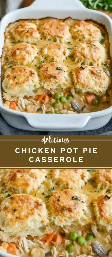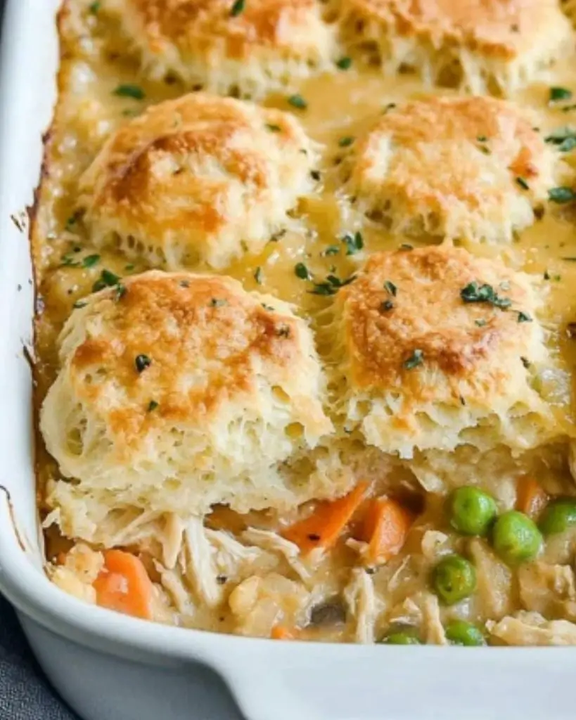This hearty Chicken Pot Pie Casserole is a comforting, family-style dish made with tender chicken, vegetables, creamy gravy, and golden biscuits baked right on top.