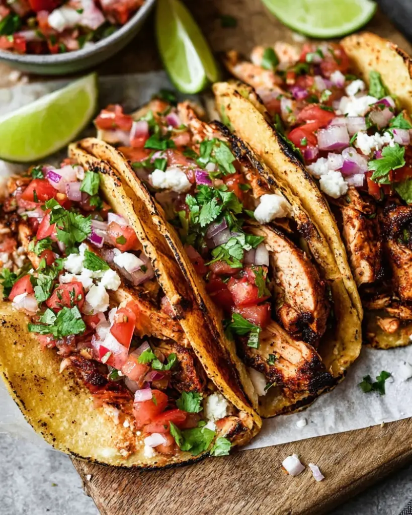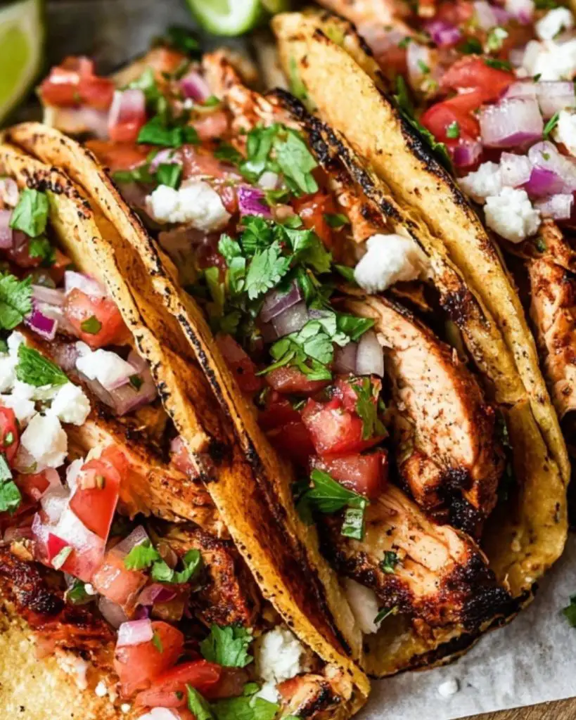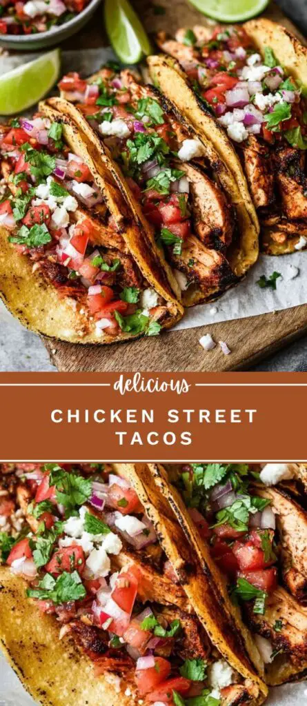 Authentic Chicken Street Tacos with juicy grilled chicken, fresh pico de gallo, and soft corn tortillas. This easy taco recipe features a smoky chipotle marinade, fresh cilantro, and lime wedges for bright flavor. Perfect for quick weeknight dinners, taco nights, or summer grilling. Customize with guacamole, sour cream, or pickled onions for a classic Mexican street food experience at home.