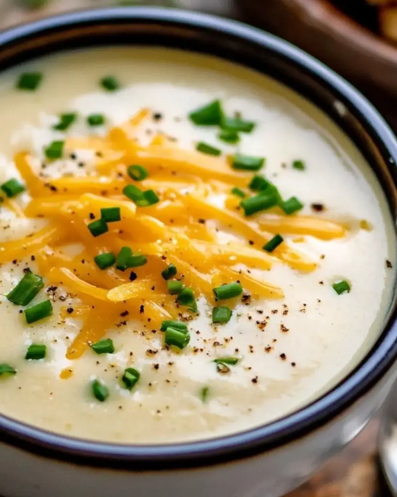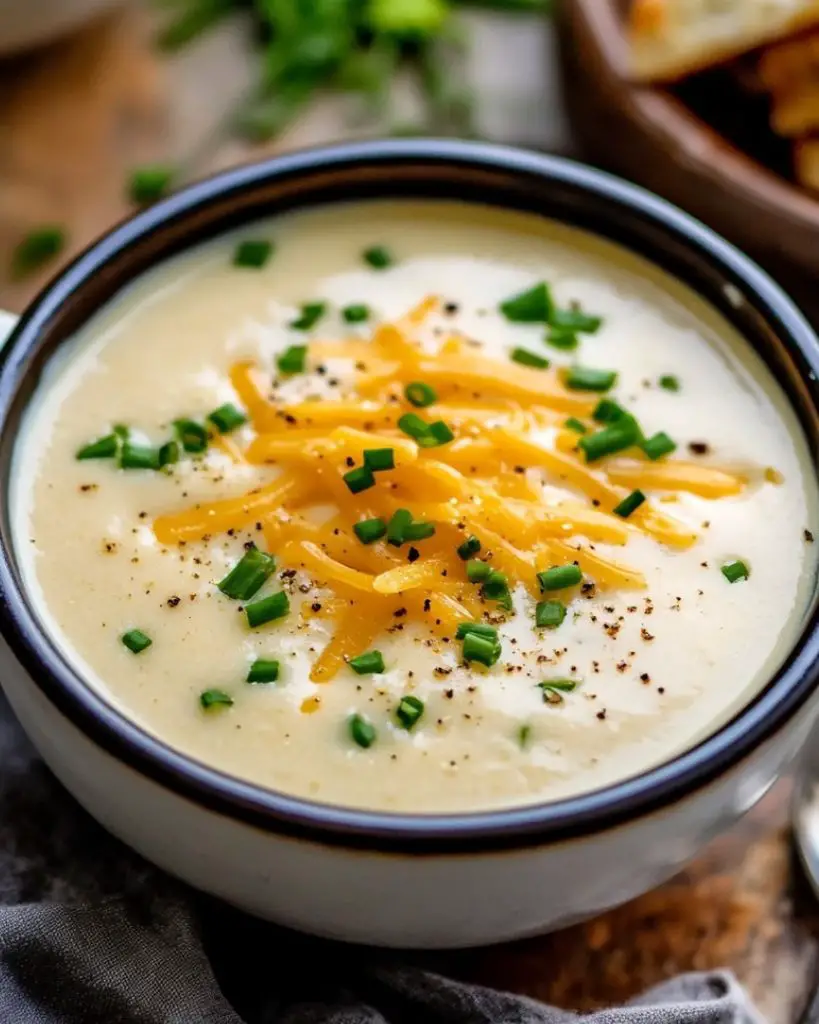 A smooth, comforting cauliflower soup made with cheddar cheese, cream, and onion, blended to silky perfection. Ideal for cozy lunches, weeknight dinners, or make-ahead meal prep.