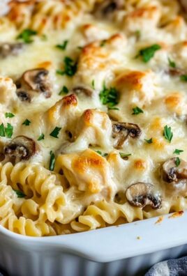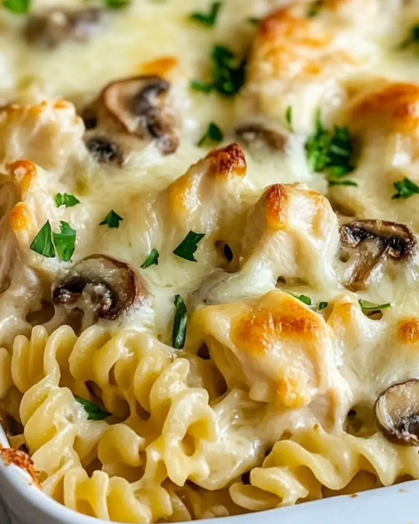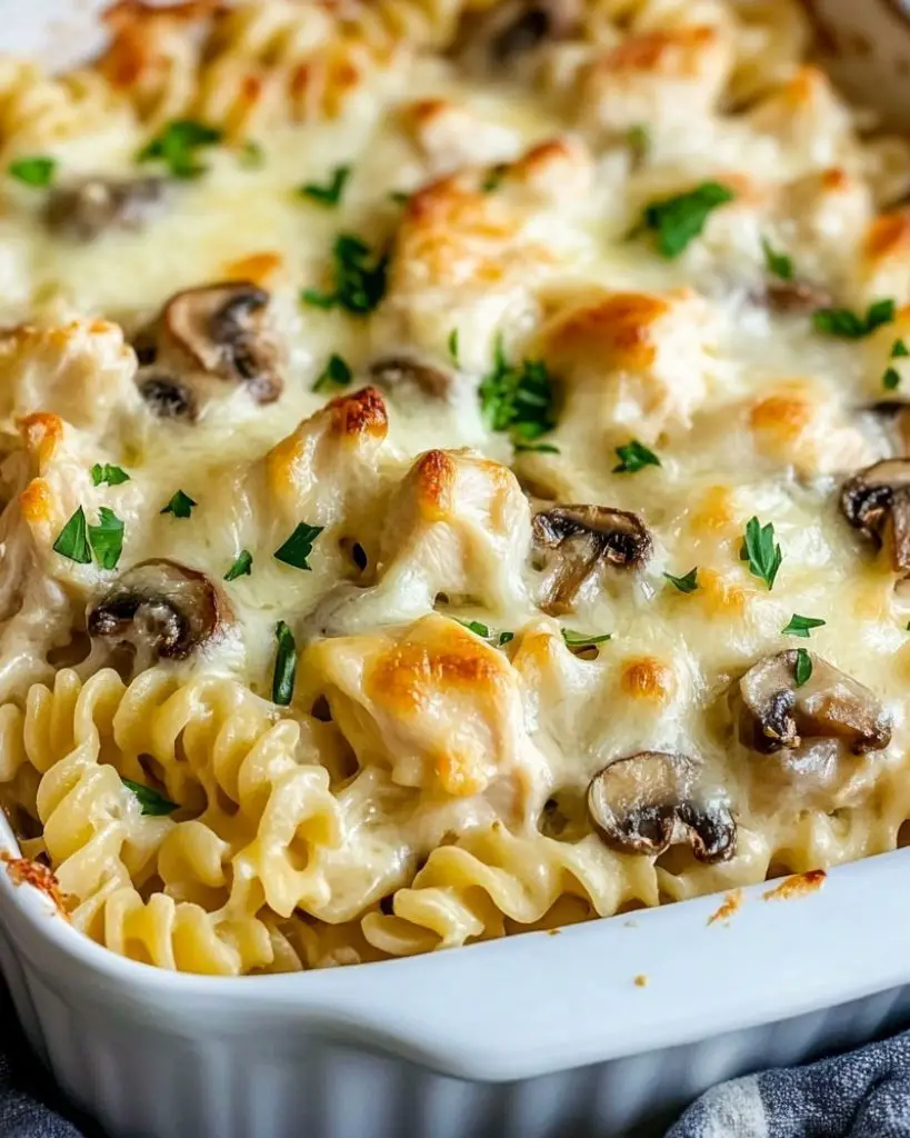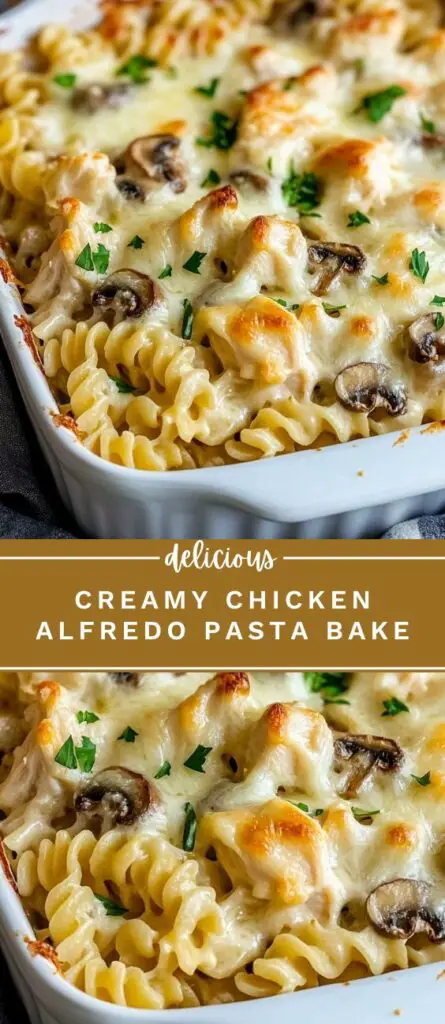 This creamy chicken Alfredo pasta bake combines tender chicken, earthy mushrooms, and a rich, cheesy sauce baked to golden perfection. It’s a comforting, easy-to-make meal perfect for family dinners or meal prep, offering satisfying flavors with minimal effort.