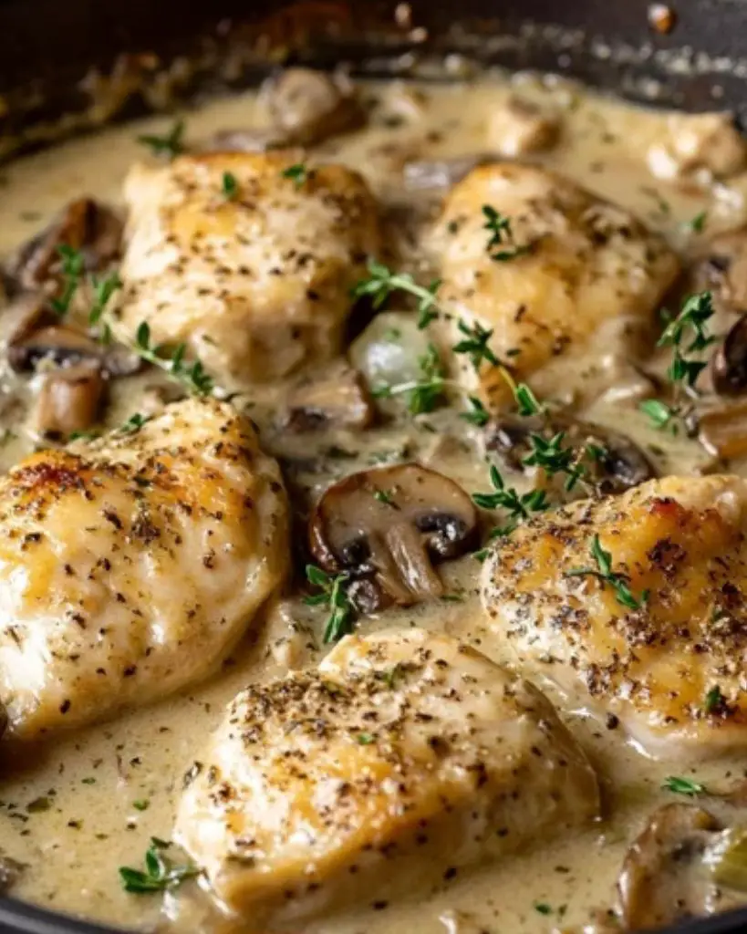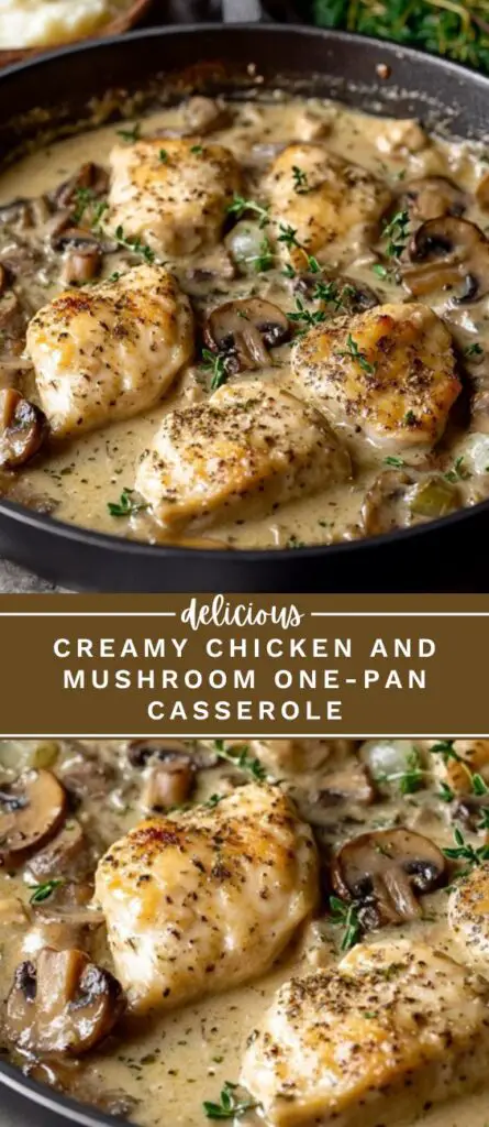Creamy chicken and mushroom casserole made in one pan with tender chicken breasts, a rich garlic and thyme sauce, and hearty chestnut mushrooms. This easy dinner recipe is perfect for busy weeknights or batch cooking. Serve with mashed potatoes and vegetables for a comforting family meal ready in under an hour.