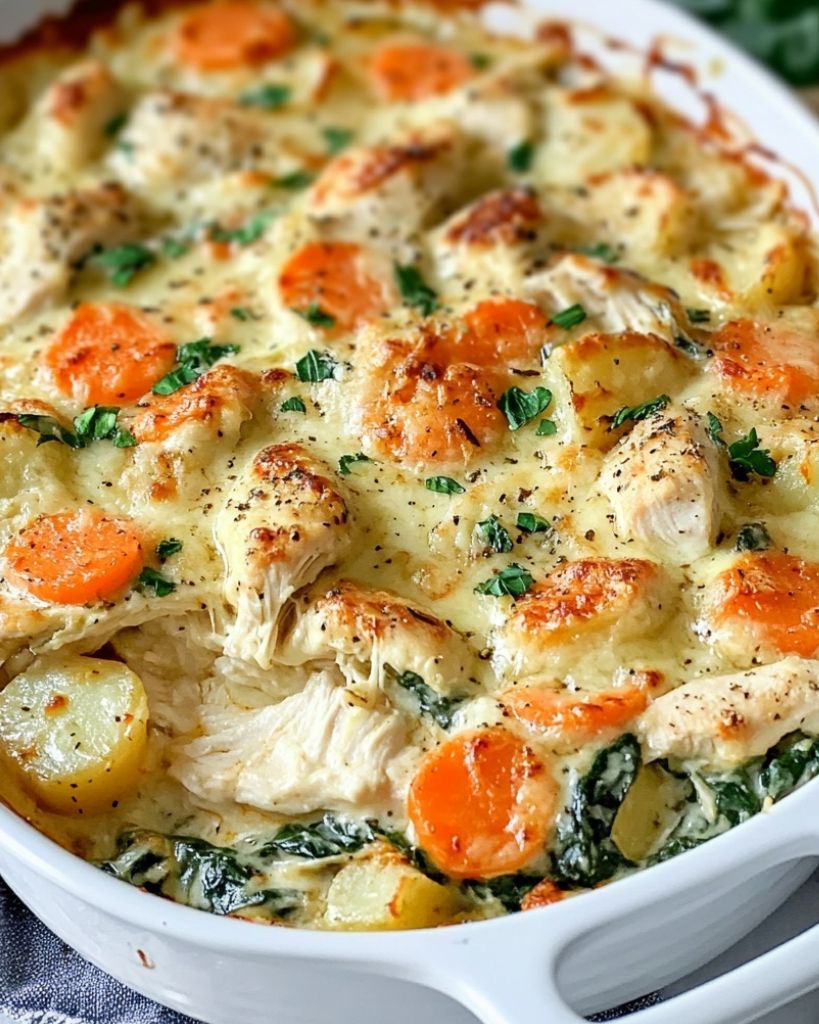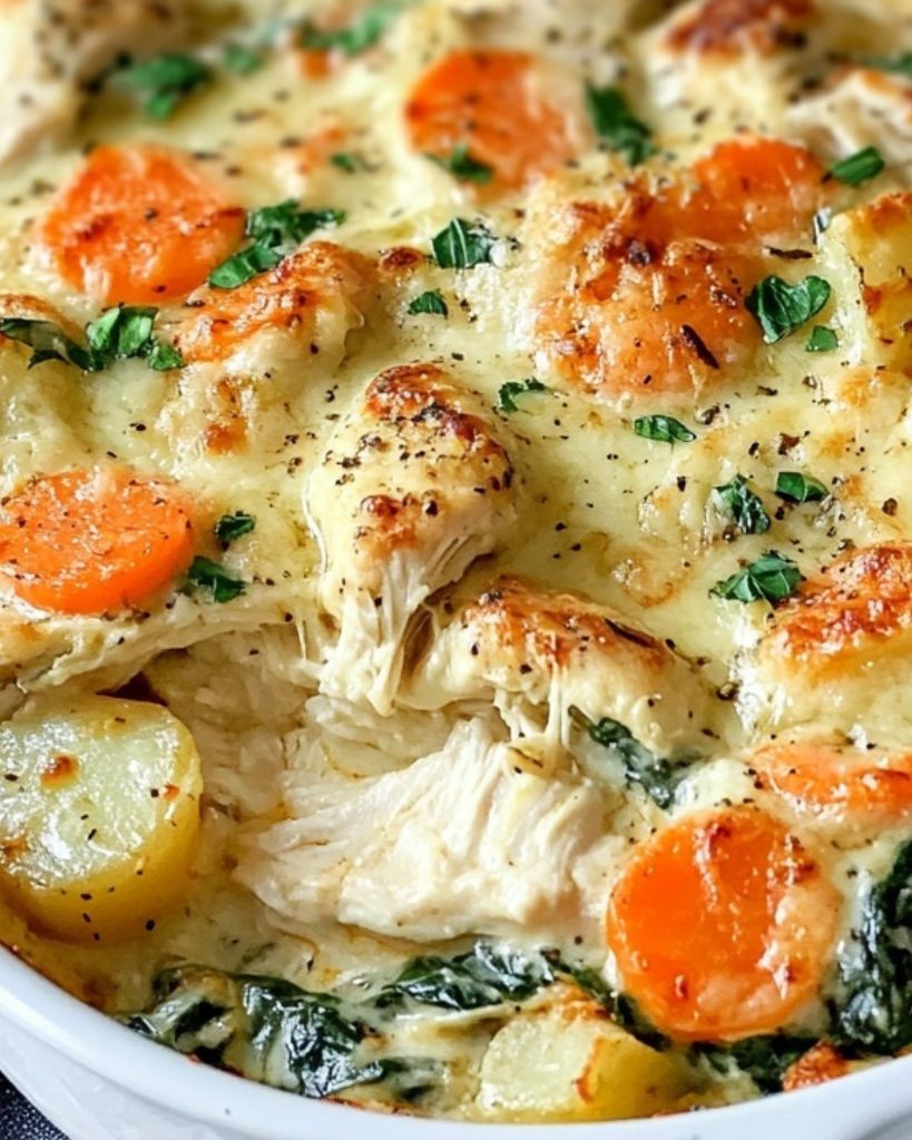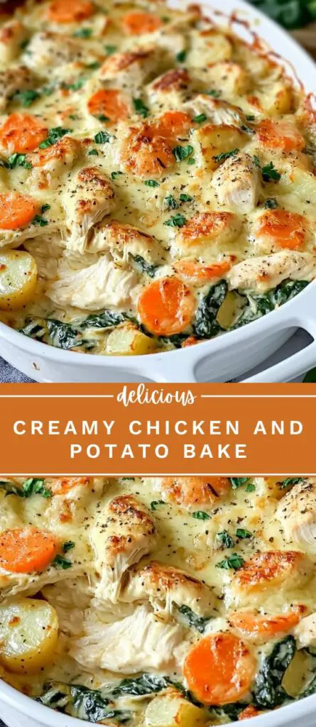 Creamy Chicken and Potato Bake is a hearty, family-friendly recipe made with tender shredded chicken, fresh spinach, carrots, and baby potatoes, all layered in a rich, cheesy cream sauce. Baked until golden and bubbling, this easy chicken casserole is perfect for weeknight dinners or meal prep. With simple ingredients like cheddar, Parmesan, Dijon mustard, and garlic, it delivers comforting flavor in every bite. Ideal for using leftover cooked chicken or rotisserie chicken, and easy to prepare ahead or freeze for later.