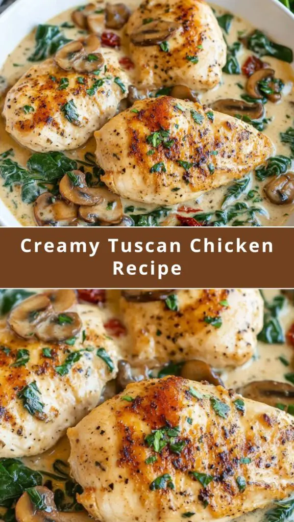This Creamy Tuscan Chicken recipe combines tender, pan-seared chicken breasts with a rich, creamy sauce made with fresh spinach, earthy mushrooms, sun-dried tomatoes, and parmesan cheese. Perfect for busy weeknights or elegant dinner parties, this recipe delivers restaurant-quality flavors with minimal effort. The sauce is silky and indulgent, featuring a blend of heavy cream, garlic, and savory spices, while the chicken stays juicy and tender. Serve with pasta, rice, or garlic bread for the ultimate comfort food experience. This dish is a flavorful, easy-to-make chicken recipe that everyone will love!