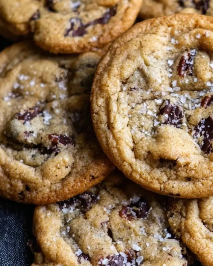 These crispy chewy chocolate chip cookies feature golden edges, soft centers, and rich dark chocolate chunks in every bite. Made with brown sugar, real butter, and simple pantry ingredients, this easy homemade cookie recipe delivers the perfect balance of chewy texture and crisp exterior. Ready in under 30 minutes, these bakery-style chocolate chip cookies are ideal for dessert, holiday baking, or everyday sweet cravings. With optional pecans and a sprinkle of flaky sea salt, this classic cookie recipe creates thick, soft cookies packed with deep chocolate flavor.