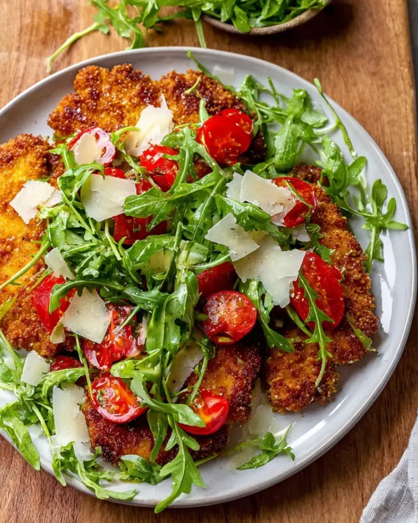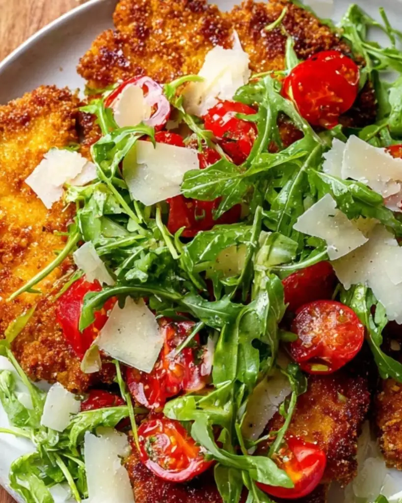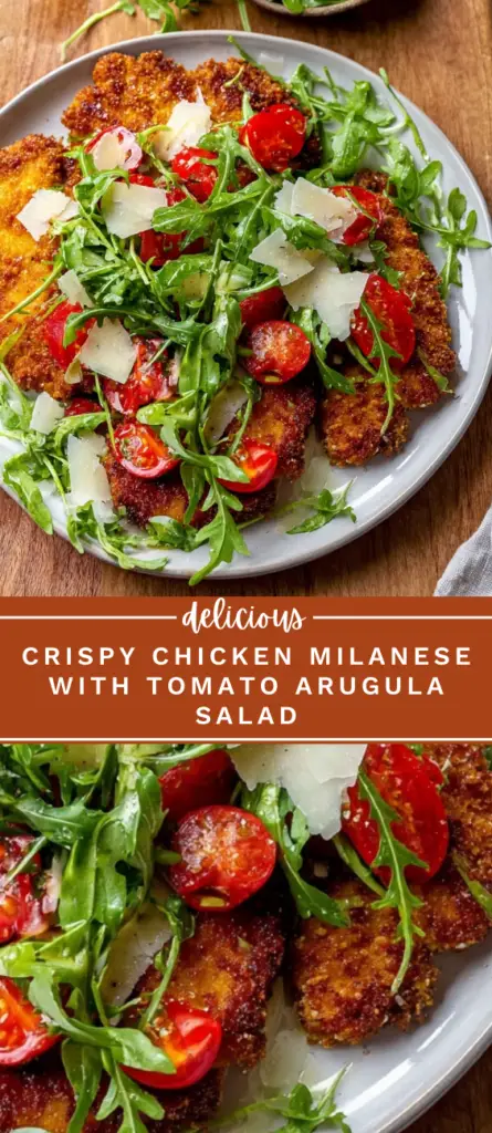 Crispy chicken Milanese made with golden breaded chicken cutlets, topped with a fresh tomato and arugula salad and shaved Parmesan. This classic Italian chicken Milanese recipe combines crunchy panko crust, juicy chicken breast, and a bright lemon dressing. Perfect for easy dinner ideas, family meals, or special occasions, this dish pairs well with pasta, salad, or roasted vegetables for a complete meal.