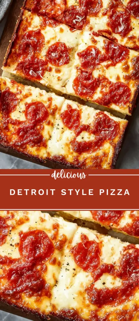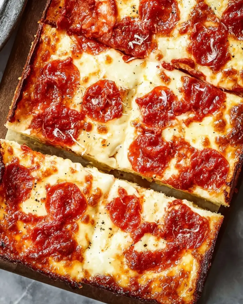 This Detroit-style pizza features a thick, airy rectangular crust with crispy, caramelized cheese edges, classic pizza sauce, and thinly sliced pepperoni. Made with bread flour and multiple rises, this pizza achieves its signature light and chewy texture. Perfect for homemade pizza nights, family dinners, or gatherings, this Detroit-style pizza recipe delivers authentic flavor with a golden, bubbly cheese topping and a crunchy yet tender crust.