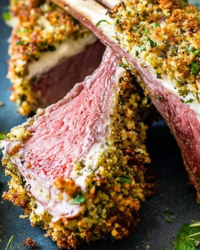 - Tender rack of lamb with a crisp, flavorful herb crust.