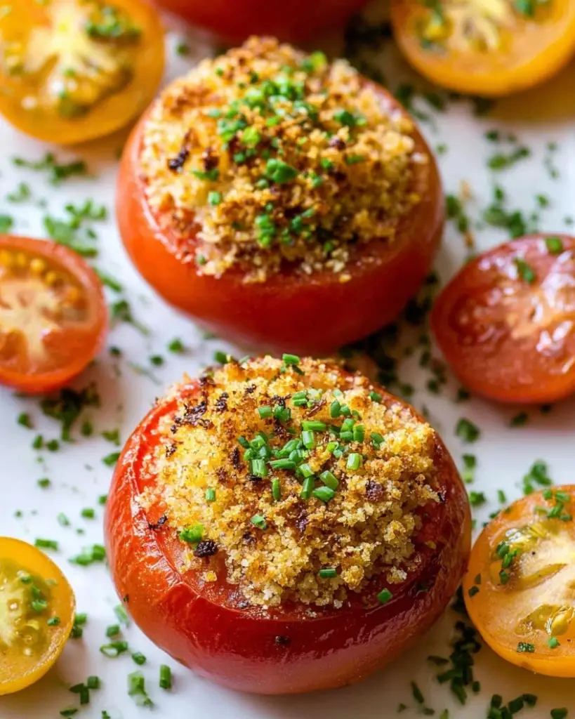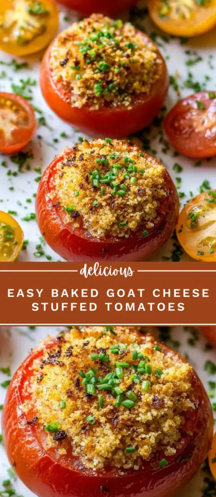 Easy baked goat cheese stuffed tomatoes featuring ripe, juicy tomatoes filled with creamy goat cheese, fresh chives, and topped with golden, crispy Panko breadcrumbs. This easy appetizer recipe is perfect for brunch, dinner parties, or healthy vegetarian meals, combining soft, warm cheese with a crunchy topping and fresh herbs for bright, flavorful bites.