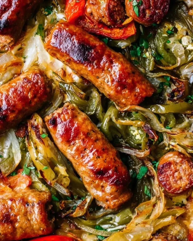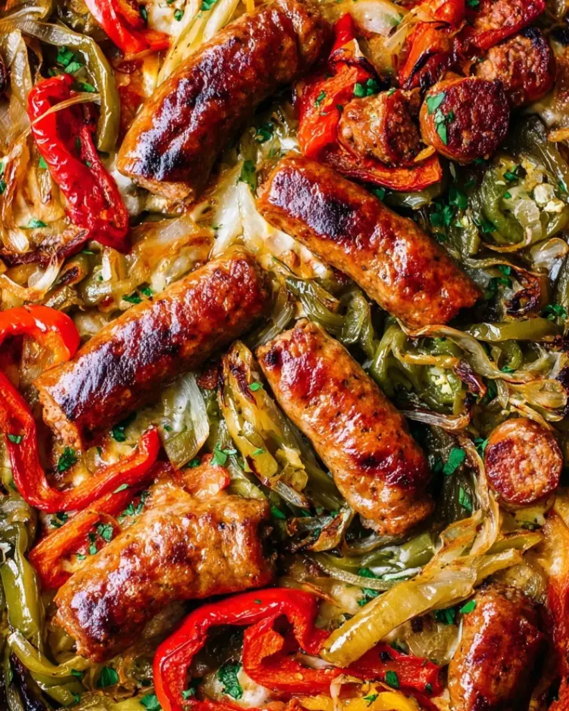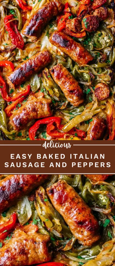 Oven-baked Italian sausage and peppers with caramelized bell peppers, onions, garlic, and optional jalapeños. This easy Italian sausage recipe features juicy sausage roasted with olive oil and herbs, perfect for weeknight dinners, sandwiches, or hearty family meals. One-pan baked sausage and peppers served with Italian bread or over pasta for classic Italian flavors at home.