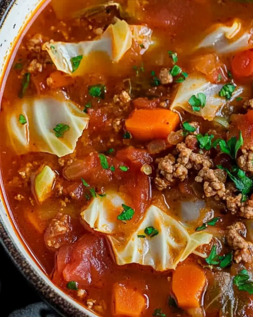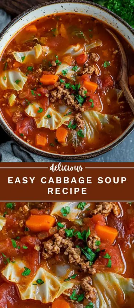 This Easy Cabbage Soup recipe is a hearty, flavorful meal made with ground beef, cabbage, carrots, and fresh herbs. Packed with nutrients and made with simple ingredients like beef broth, diced tomatoes, and tomato sauce, this soup is perfect for a cozy dinner or meal prep. With a rich combination of savory flavors and vegetables, it’s an ideal option for a healthy, comforting dish. Whether you’re looking for a quick weeknight meal or a filling soup for a crowd, this cabbage soup is easy to make and can be customized with additional veggies or herbs.