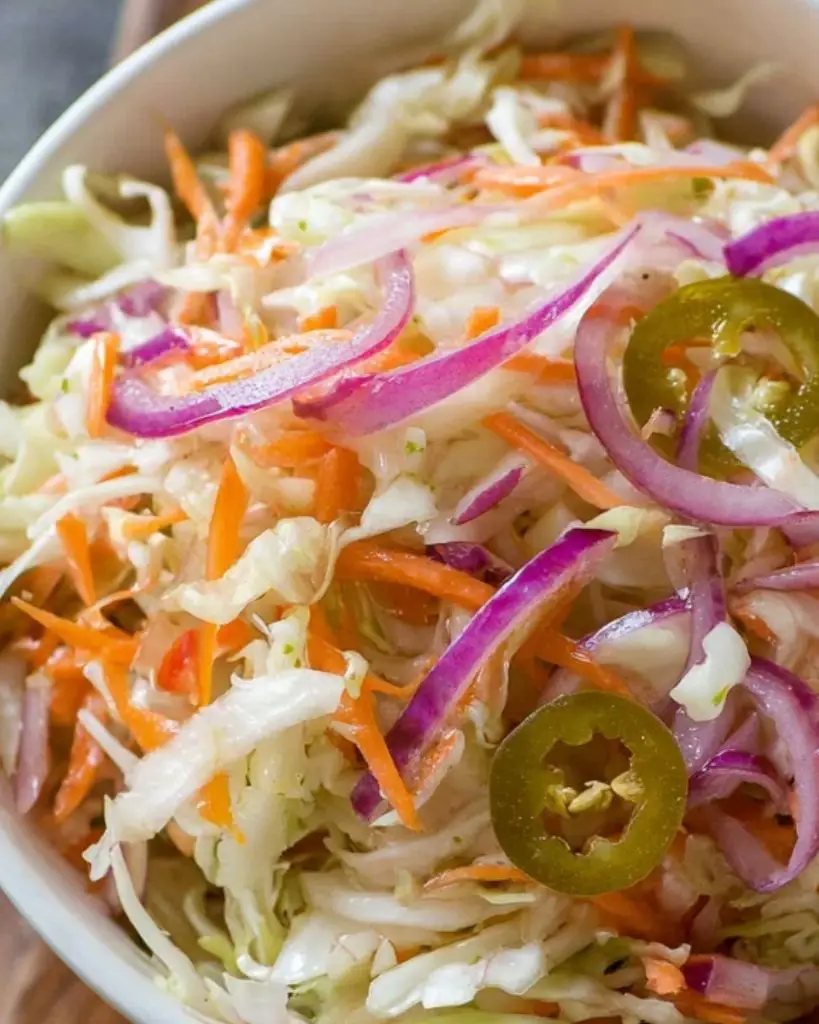 - Transfer the drained cabbage to a large bowl. Add the shredded carrots, sliced red onion, jalapeño (if using), oregano, vinegar, and salt. Toss everything together until well combined.