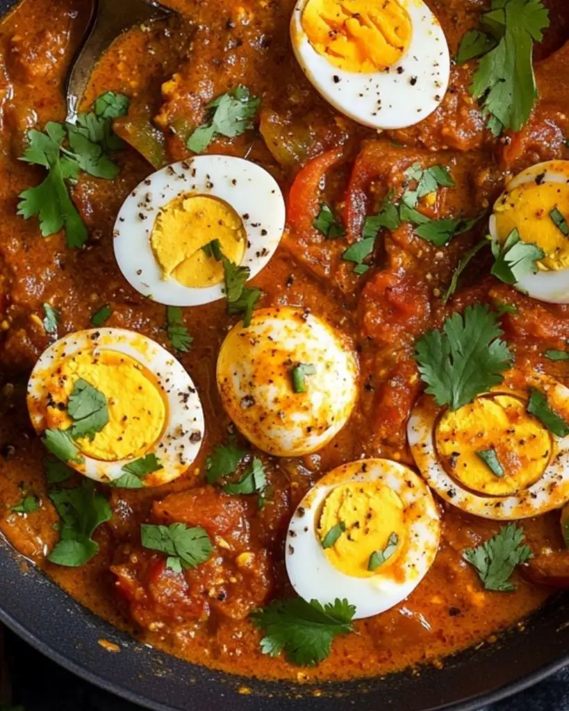 Peel the cooled eggs and slice them in half. Gently place them into the curry and cook for another 3–4 minutes to heat through. - Serve: