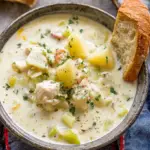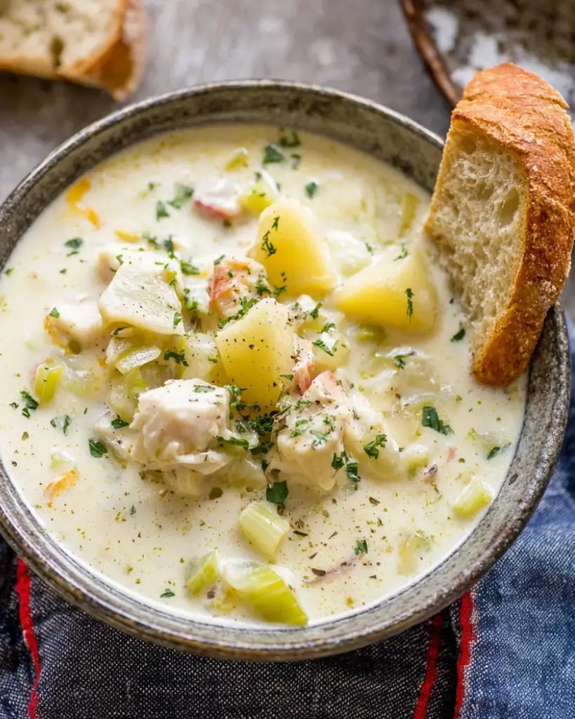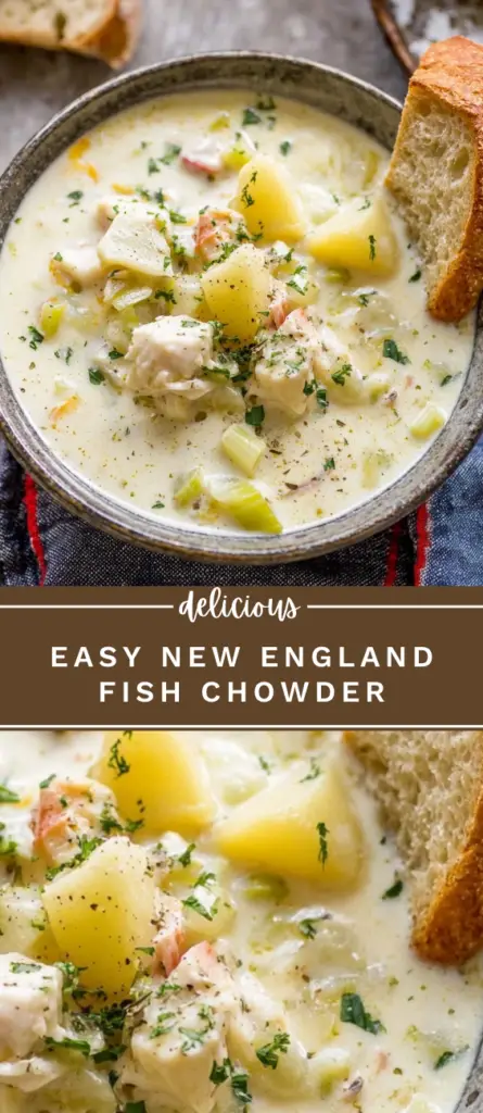 Easy New England fish chowder made with cod, haddock, or halibut, tender potatoes, celery, onion, and cream. This classic fish chowder recipe is creamy, comforting, and simple to prepare, making it perfect for weeknight dinners or cold weather meals. A traditional New England seafood chowder with fresh white fish, rich flavor, and a smooth texture, served hot with crusty bread.