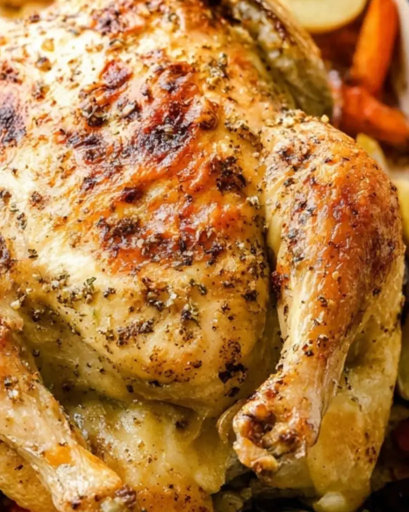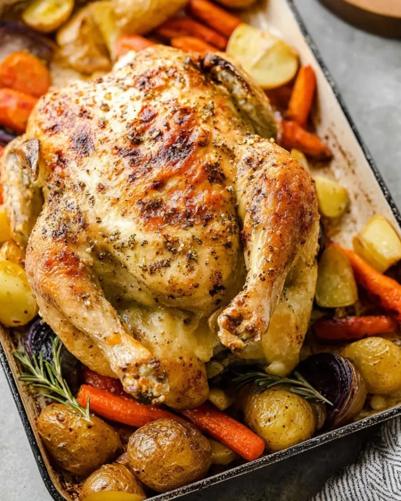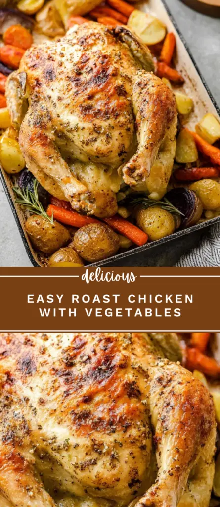 Easy roast chicken recipe made with butter, lemon, rosemary, and vegetables, oven roasted until golden and juicy. A classic whole roast chicken with crispy skin, tender meat, and perfectly roasted potatoes and carrots, ideal for family dinners and simple homemade meals.