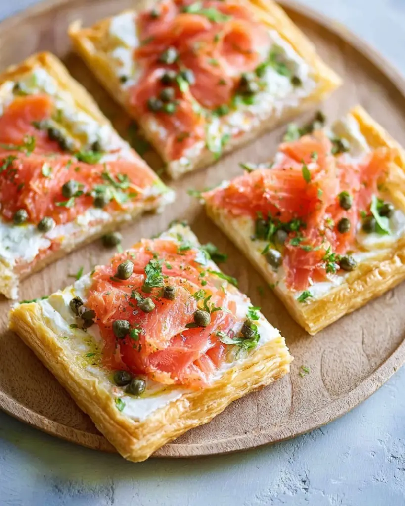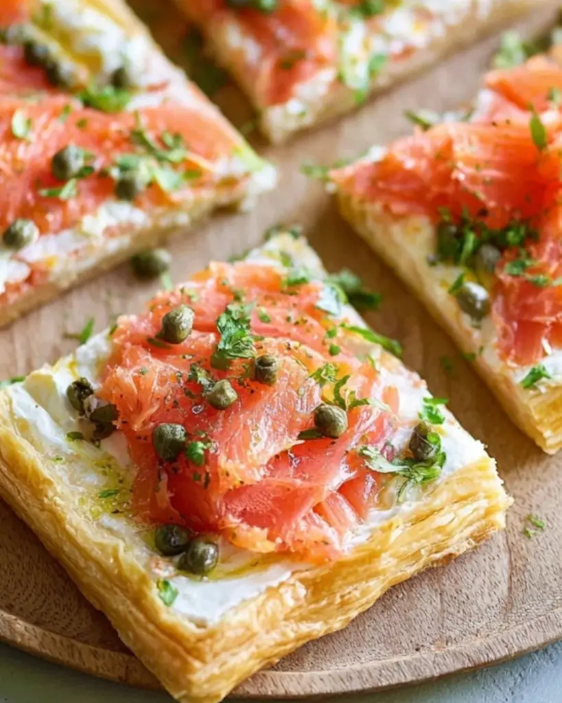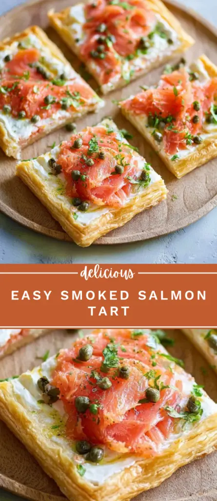 Smoked salmon tart with flaky puff pastry, cream cheese, capers, and fresh herbs. Quick and easy appetizer or brunch recipe with lemon and scallions. Perfect for entertaining, parties, or light meals.