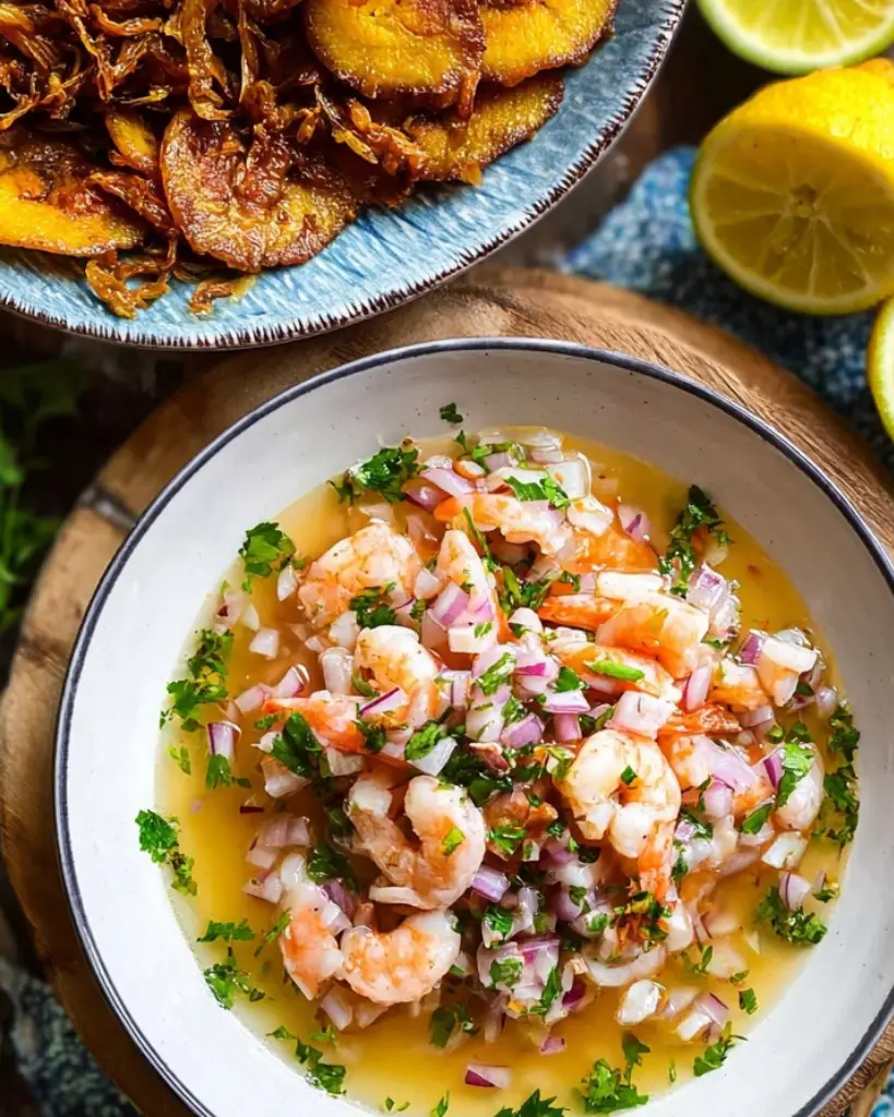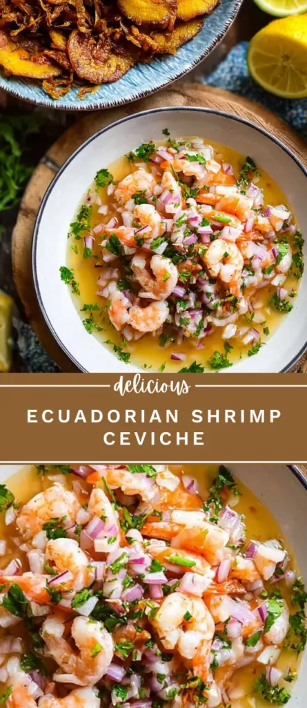 Ecuadorian Shrimp Ceviche is a refreshing Latin American seafood dish made with tender poached shrimp, fresh lemon and orange juice, red onion, cilantro, and a touch of ketchup for authentic flavor. This traditional ceviche recipe is served chilled with crispy green plantains, creating the perfect balance of citrus, sweetness, and crunch. Ideal for summer meals, appetizers, or light seafood dinners, this easy shrimp ceviche brings vibrant coastal flavors to your table.