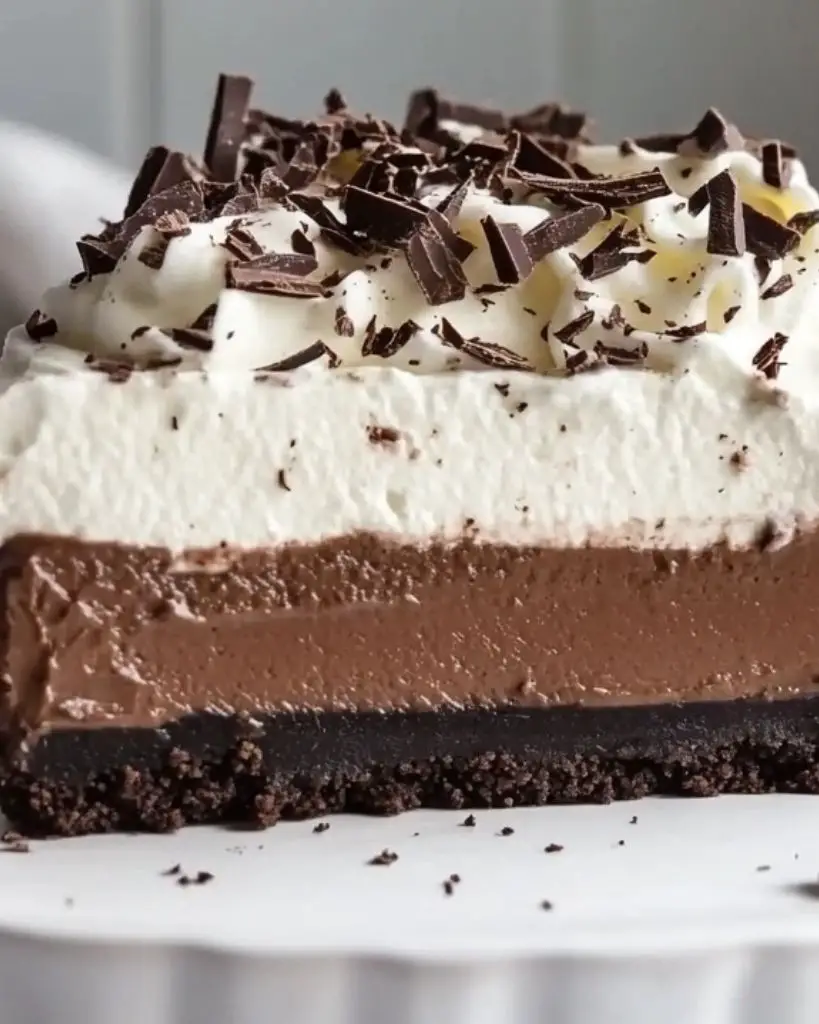 A rich, velvety French Silk Pie with a crunchy Oreo crust, topped with sweetened whipped cream and chocolate curls. This indulgent dessert is perfect for any occasion.