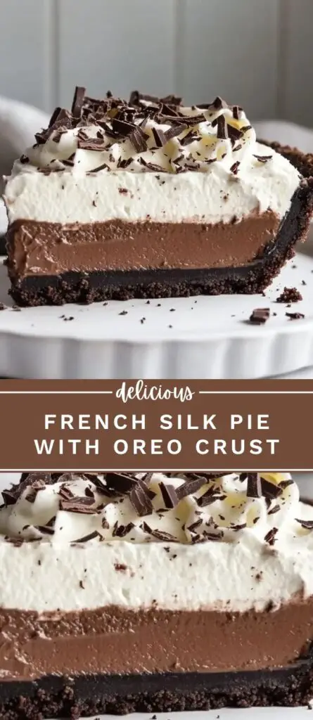 French Silk Pie with Oreo Crust is a rich and creamy dessert featuring a smooth chocolate filling in a crunchy Oreo cookie crust. This no-bake pie is topped with fluffy whipped cream and finished with chocolate curls, making it a perfect treat for any occasion. Ideal for chocolate lovers, this pie combines a decadent filling and a simple, easy-to-make crust for a luxurious dessert experience.