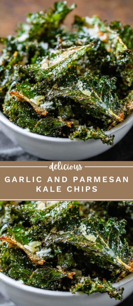This garlic and Parmesan kale chips recipe makes a crispy, healthy snack baked in the oven with olive oil, fresh garlic, and grated Parmesan. Easy to prepare, these kale chips are a flavorful alternative to potato chips and perfect for parties, appetizers, or a quick homemade snack.