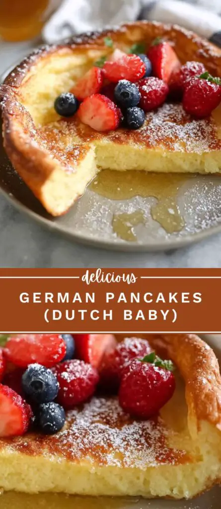 German Pancakes, also known as Dutch Baby Pancakes, are a light and fluffy oven-baked breakfast made with eggs, milk, flour, and butter. This easy recipe puffs up in the oven with golden edges and a soft center. Perfect for breakfast, brunch, or dessert, these pancakes can be served with powdered sugar, syrup, fresh fruit, or savory toppings.