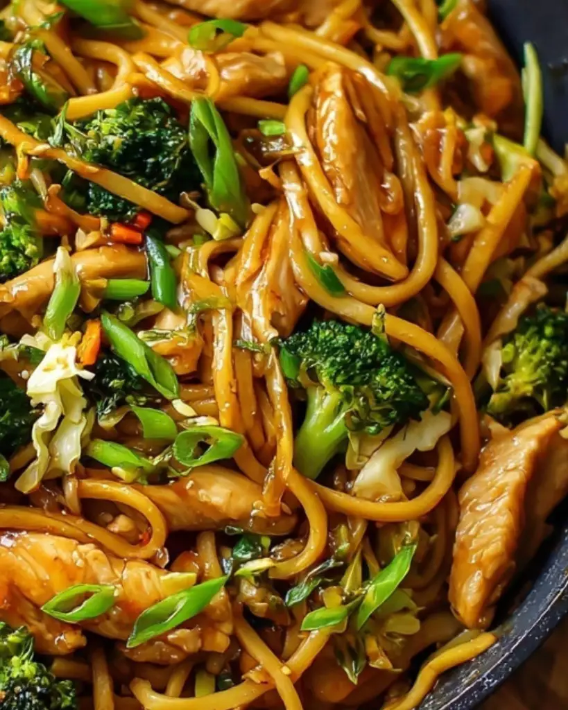 - Return the chicken to the wok, add the cooked noodles and sauce, and stir-fry until the sauce thickens, about 1–2 minutes. Serve immediately.