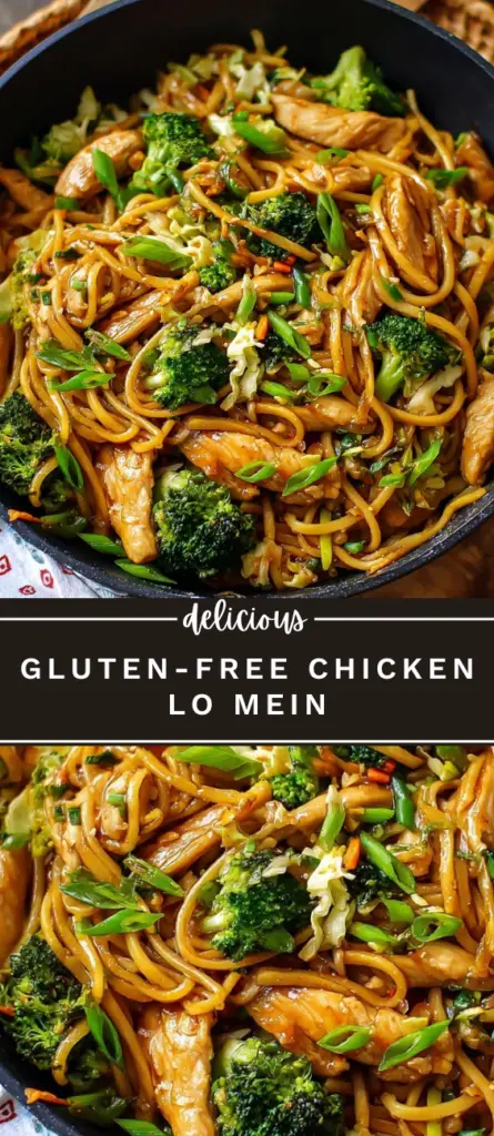 Gluten-free chicken lo mein with tender chicken strips, fresh broccoli, coleslaw mix, and green onions tossed in a flavorful homemade Asian-style sauce. This easy stir-fry recipe uses gluten-free tamari and oyster sauce for authentic taste, perfect for quick weeknight dinners, healthy meal prep, or family-friendly meals. Serve with rice noodles or ramen noodles for a complete gluten-free dinner.