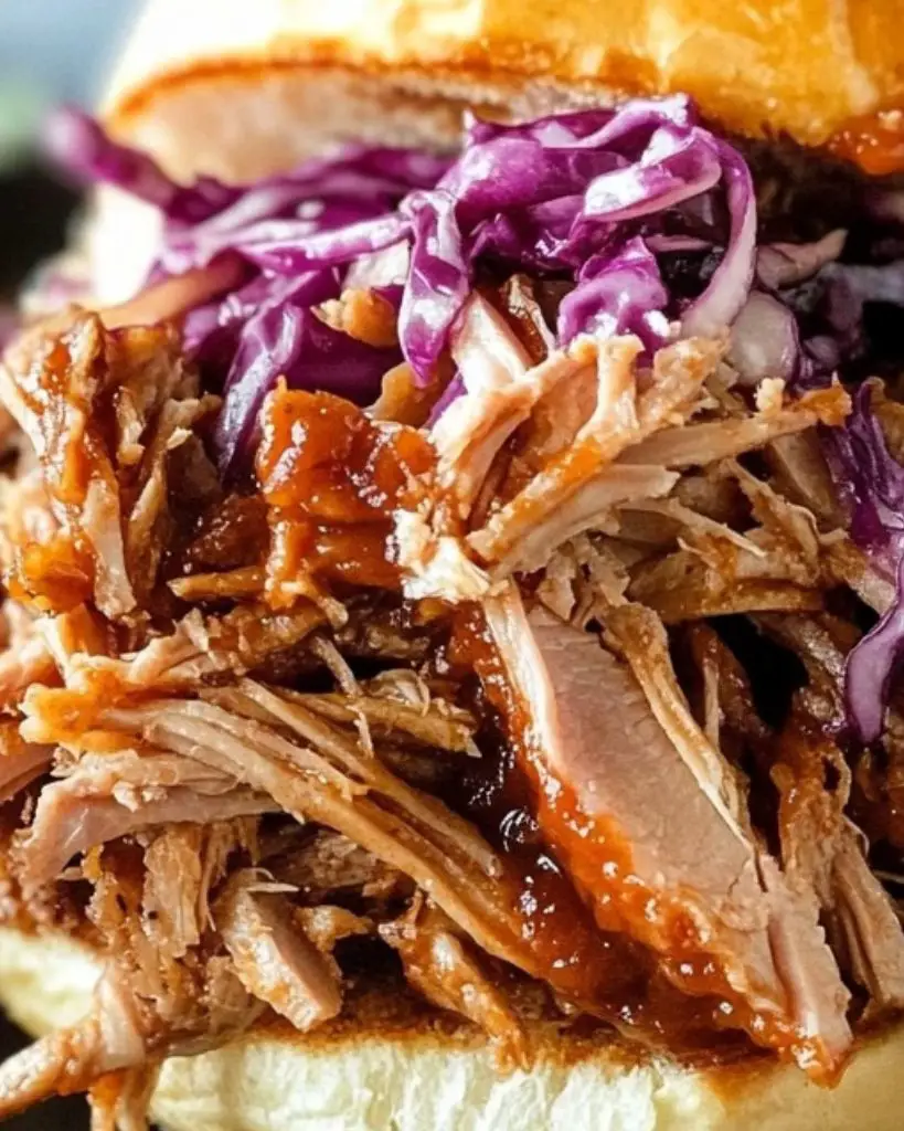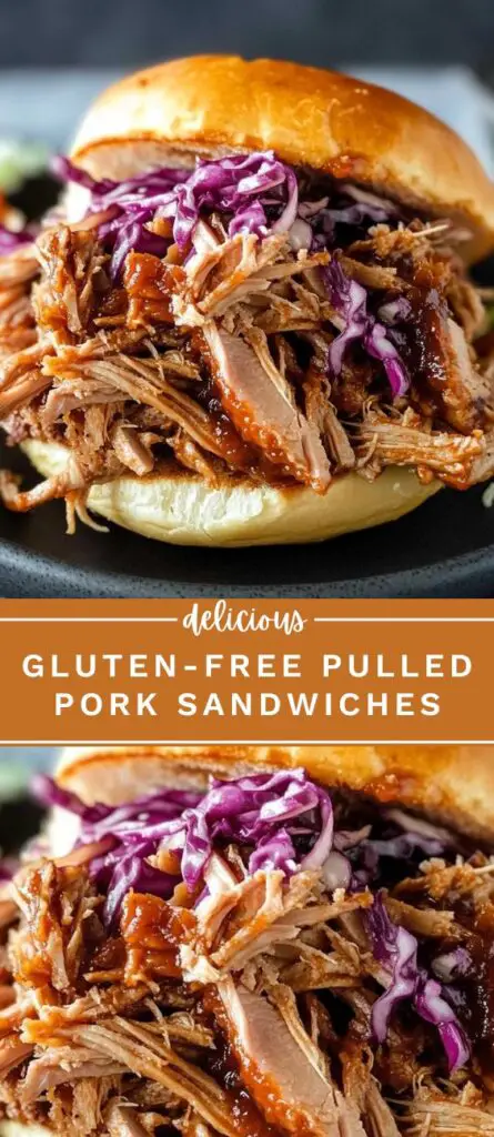 - Build the Sandwiches: Combine 4 tablespoons of the leftover cooking juices with 4 tablespoons of BBQ sauce. Drizzle over shredded pork. Assemble sandwiches on gluten-free buns with pulled pork, bacon, pickles, and slaw.