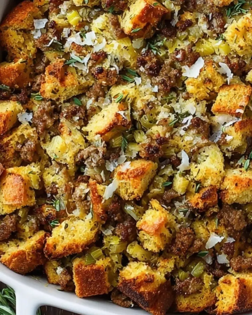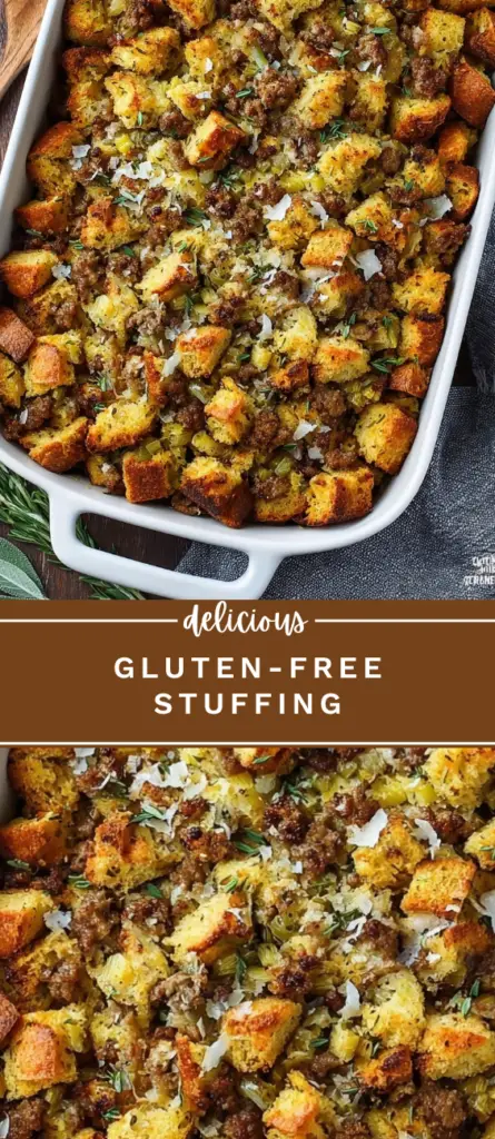 Gluten-Free Stuffing with toasted bread cubes, Italian sausage, fresh herbs, and Parmesan cheese. Moist, flavorful, and crispy on top, perfect for holiday dinners or family meals.