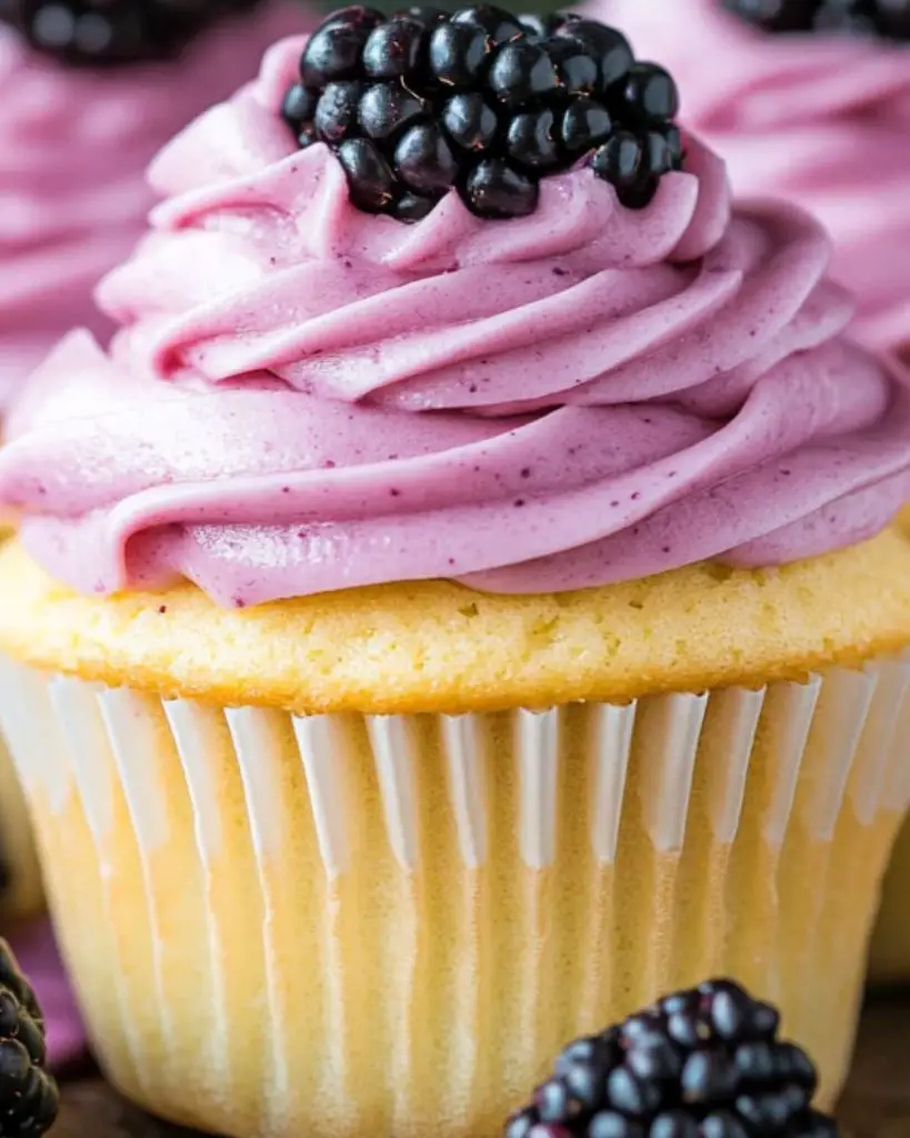 - Top each cupcake with a fresh blackberry for garnish.