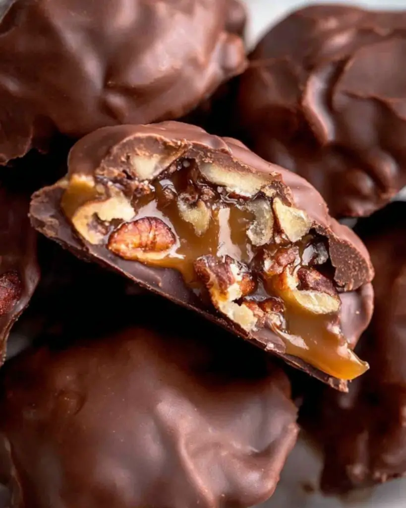 - Drop spoonfuls of the caramel-pecan mixture onto the prepared baking sheet to form individual mounds. Refrigerate 20 minutes or until set.