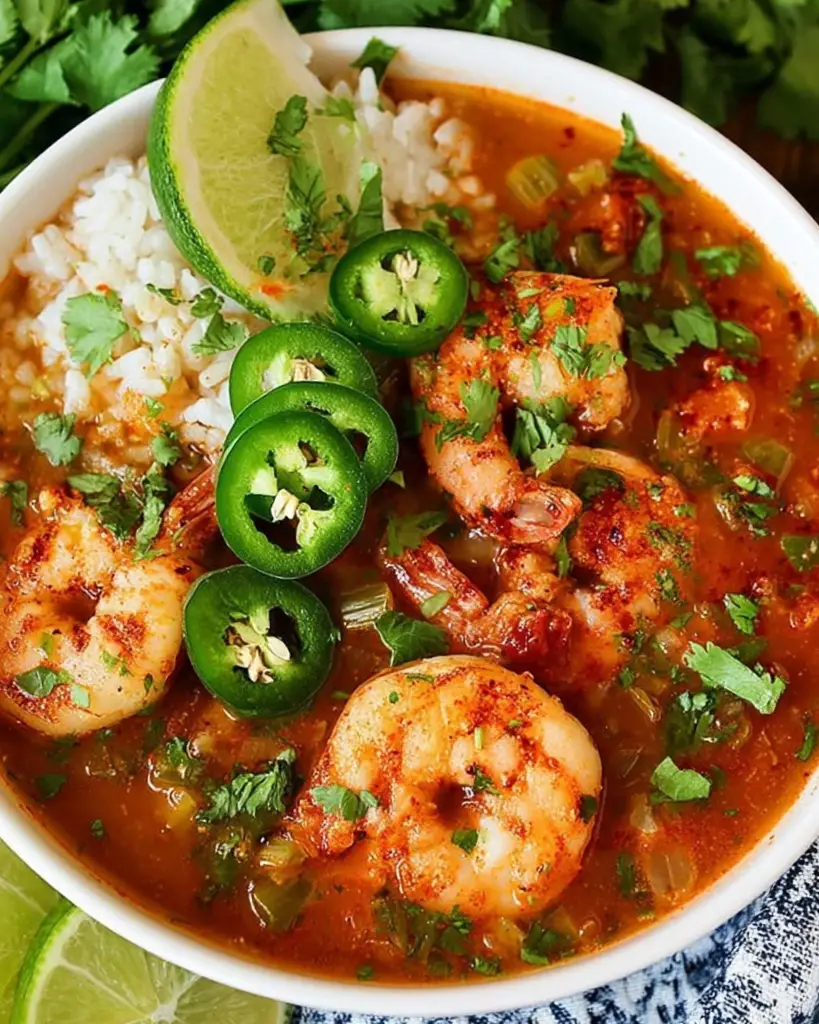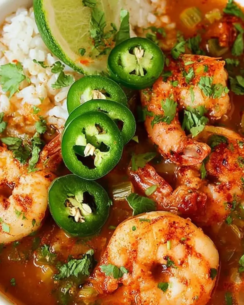 This Spicy Shrimp Soup features tender jumbo shrimp, fresh jalapeños, and aromatic garlic and shallots simmered in a flavorful tomato and seafood broth. Served over rice and garnished with cilantro and lime, this easy-to-make soup is perfect for seafood lovers, spicy food enthusiasts, and quick weeknight meals.