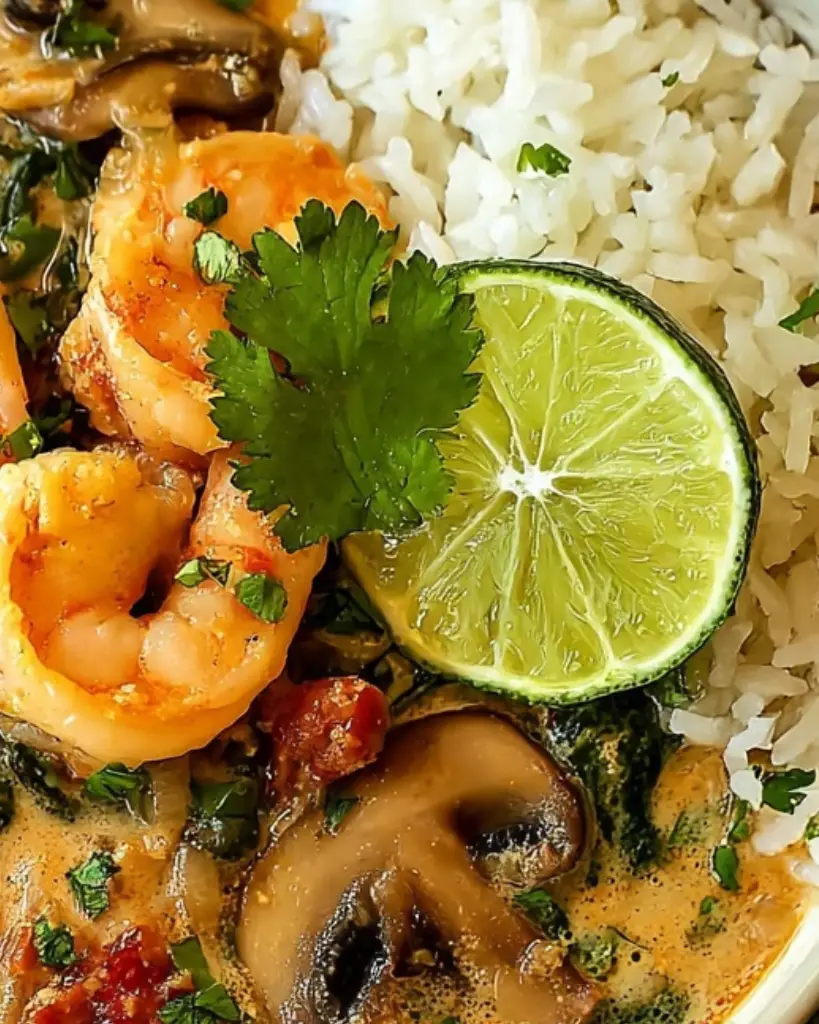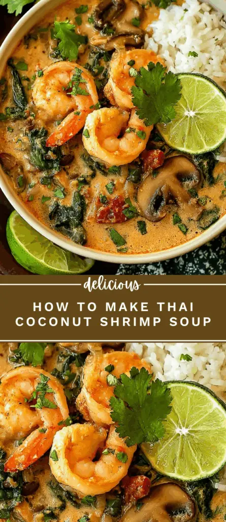 This Thai Coconut Shrimp Soup features a rich coconut milk base, tender jumbo shrimp, fresh spinach, and mushrooms simmered with red curry, garlic, and ginger. Served with rice and garnished with lime and cilantro, this easy-to-make soup is perfect for weeknight dinners, seafood lovers, and authentic Thai-inspired meals.