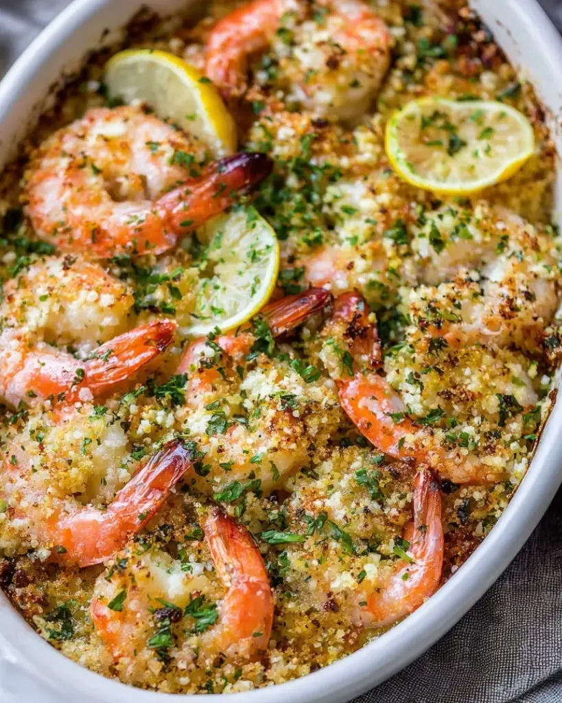 This baked shrimp scampi recipe features tender shrimp tossed with lemon juice and white wine, topped with buttery panko breadcrumbs, garlic, and fresh parsley, then baked until golden and bubbling. Ready in just 15 minutes, this easy oven-baked shrimp scampi delivers classic garlic butter flavor with a crisp, crunchy topping.