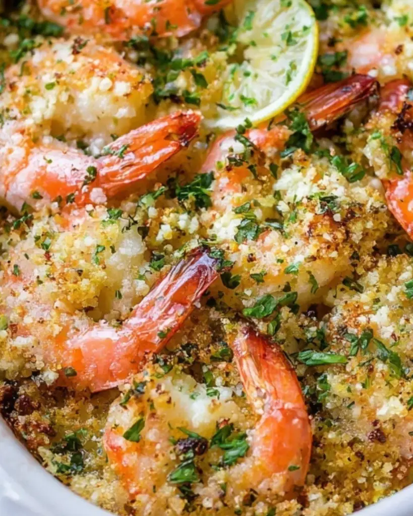 - Spoon the buttery breadcrumb mixture evenly over the shrimp, spreading it gently to cover the surface.