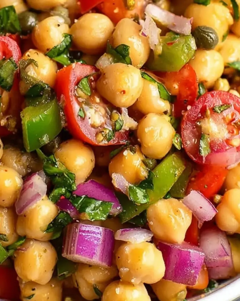 Italian chickpea salad is a fresh and healthy Mediterranean-style recipe made with canned chickpeas, tomatoes, bell pepper, red onion, basil, and capers tossed in Italian dressing. This easy no-cook salad is gluten free, vegan friendly, and perfect for meal prep, summer lunches, or potlucks. Packed with plant-based protein and fiber, chickpea salad works well as a side dish or light main and pairs easily with grilled meats, seafood, or crusty bread.