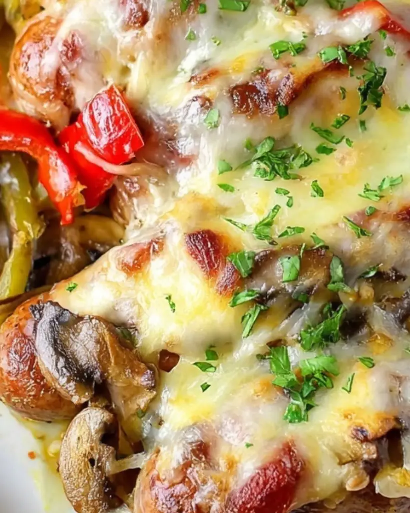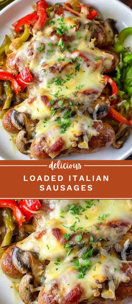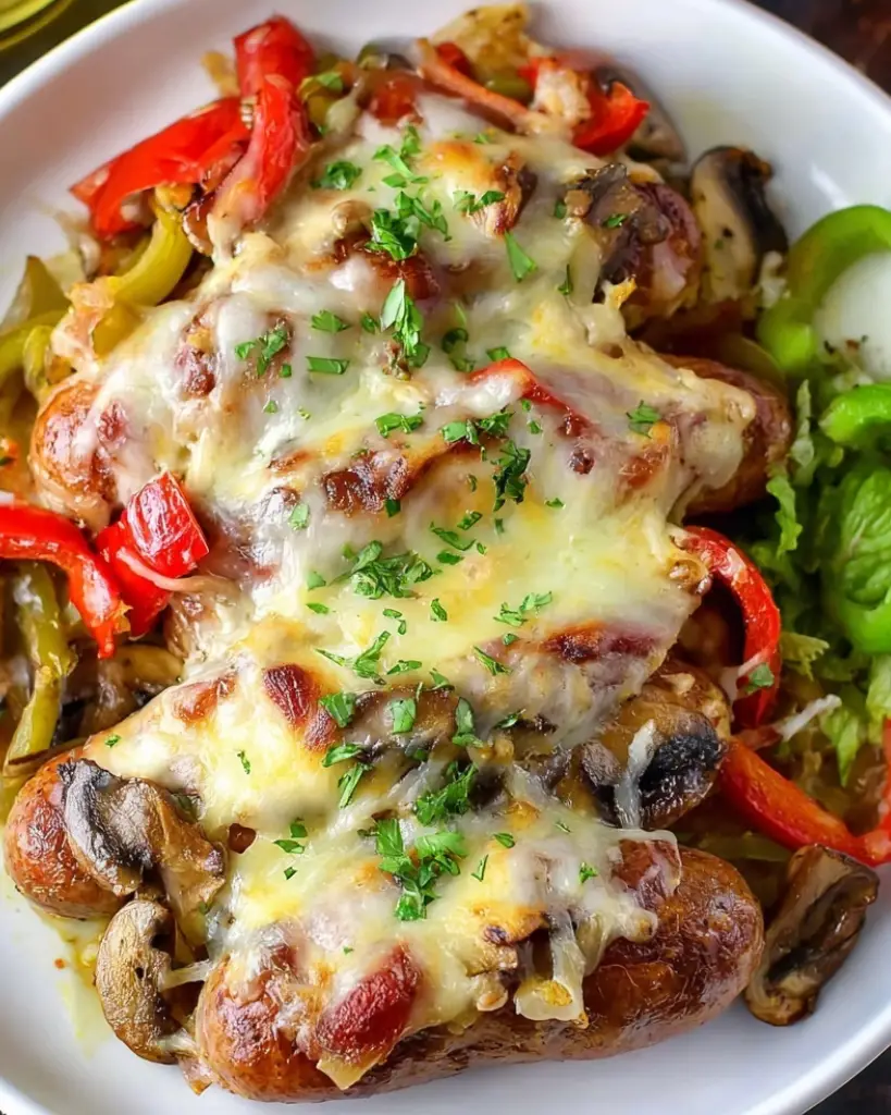 Loaded Italian sausages baked with bell peppers, onions, mushrooms, garlic, and melted mozzarella cheese. This easy oven-baked Italian sausage recipe starts on the stovetop for rich flavor, then finishes in the oven for a quick dinner. Perfect for busy weeknights, low carb meals, and family dinners, these cheesy sausages pair well with bread, pasta, or salad and use simple ingredients for a flavorful, satisfying meal.