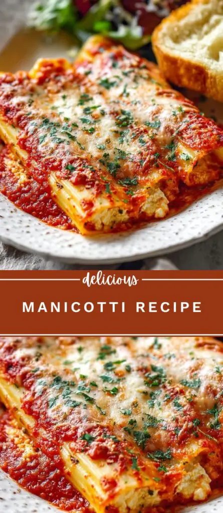 This classic manicotti recipe features tender pasta rolled with a rich ricotta, mozzarella, and Parmesan filling, baked in marinara sauce until bubbly and golden. Perfect for a comforting family dinner, holiday gathering, or special occasion, this Italian pasta dish is easy to prepare, freezer-friendly, and always a crowd favorite. Serve with garlic bread and a fresh salad for a complete Italian-style meal.